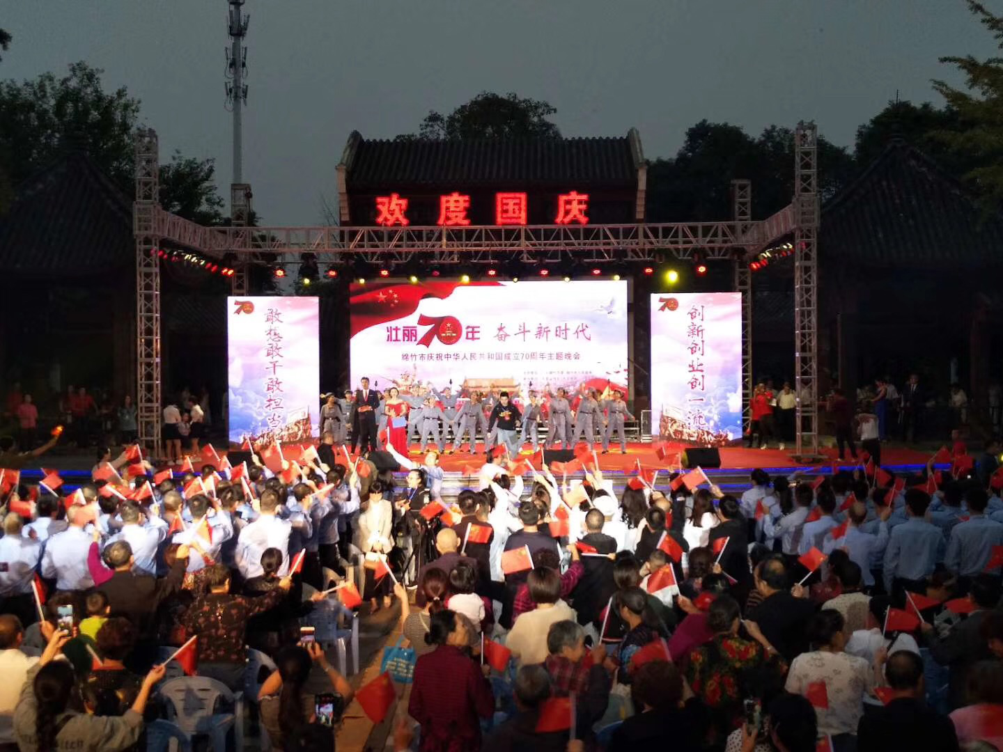 9月25日晚,由中共绵竹市委、绵竹市人民政府主办,市委宣传部、市文旅局承办的“壮丽70年,奋斗新时代”庆祝中华人民共和国成立70周年主题晚会在市人民公园杨锐广场隆重举行。当晚,舞台上流光溢彩,绚丽多姿;舞台下欢声笑语,掌声阵阵。整台演出由“光辉岁月”、“幸福家园”、“辉煌未来”三个篇章组成。