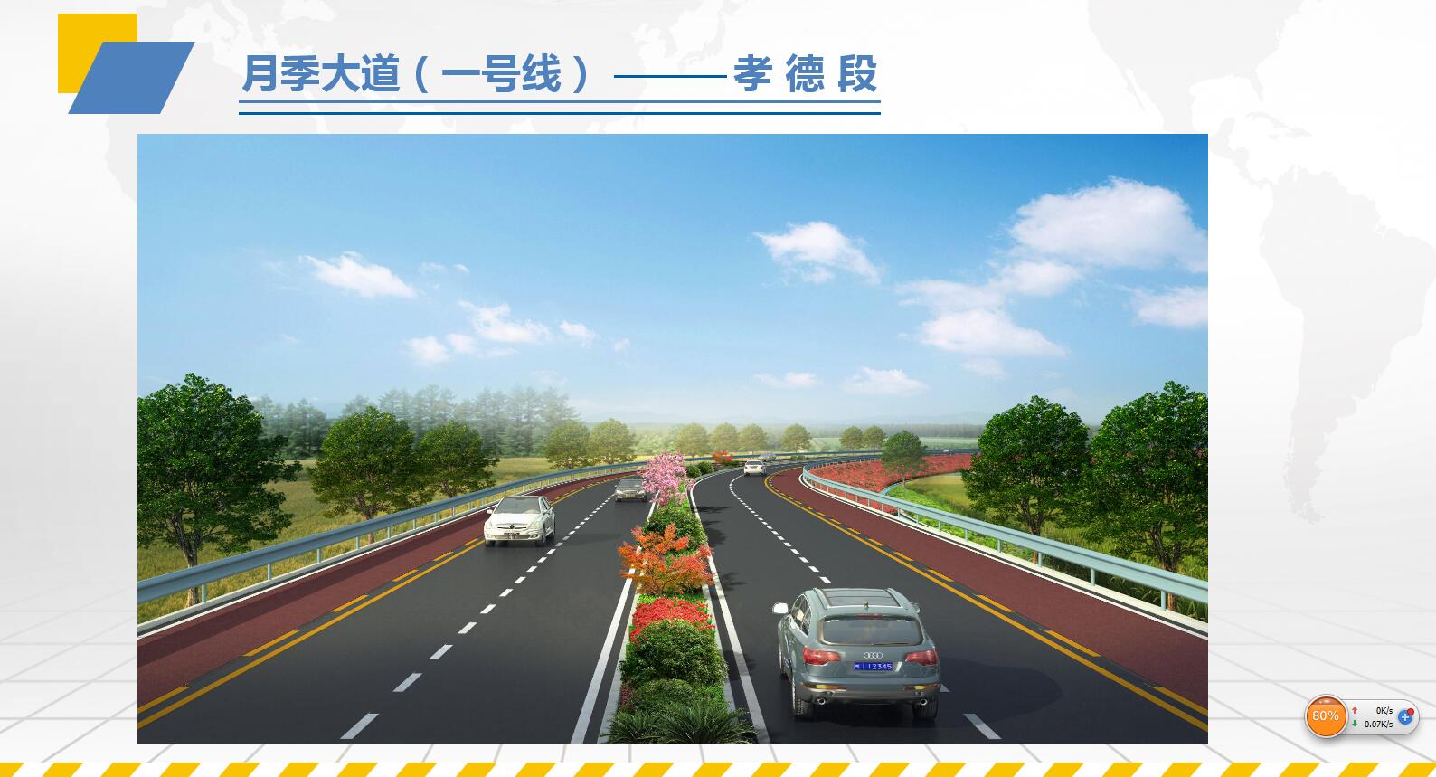 1.迎宾大道 路线全长约3.0公里,双向六车道一级公路技术标准,设计速度80km/h,沥青混凝土路面;拟在两侧新建侧分带、辅道、路灯等附属设施(含人民渠中桥设计)。单侧辅道宽度不低于7.5m,须注重与原路面、外侧绿化、骑游道的结合。同时对成绵复线匝道周边进行景观改造。项目投资约6800万元。