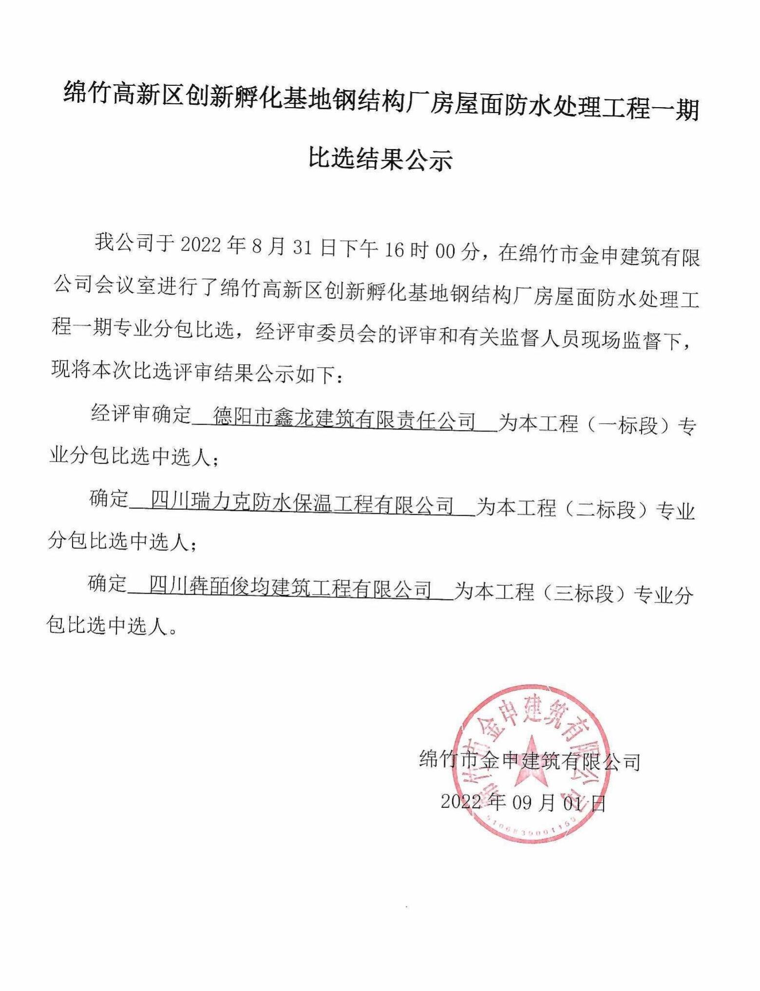 绵竹高新区孵化基地钢化厂房防水工程一期比选结果公示