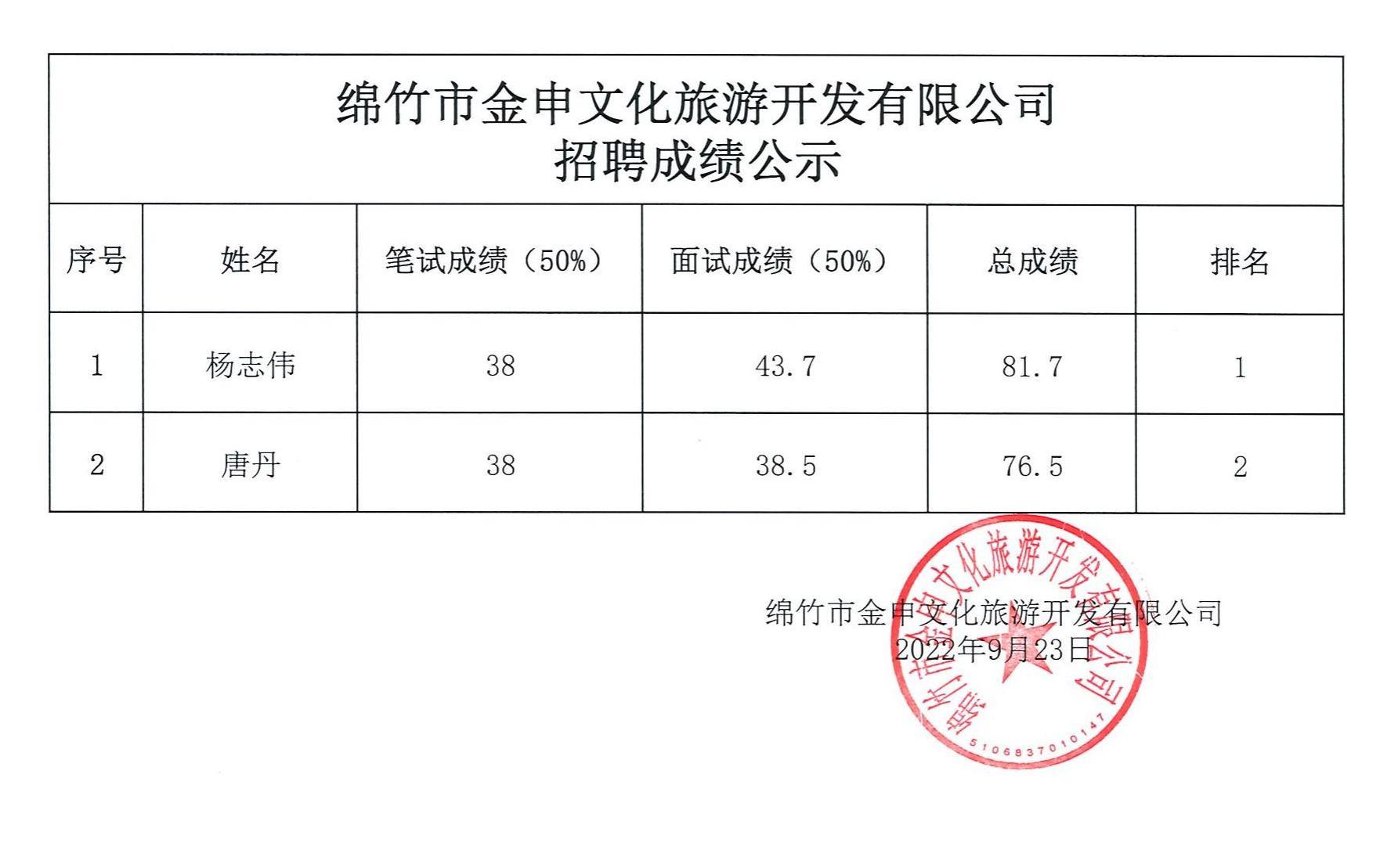 绵竹市金申文化旅游开发有限公司招聘成绩公示