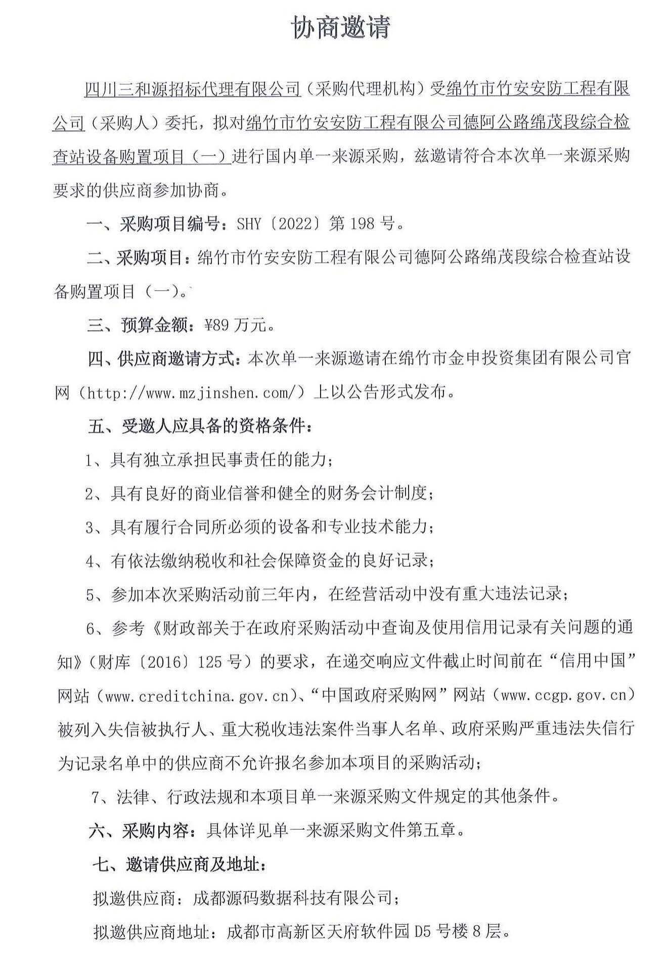 德阿公路绵茂段检查站设备购置项目(一)协商邀请公告