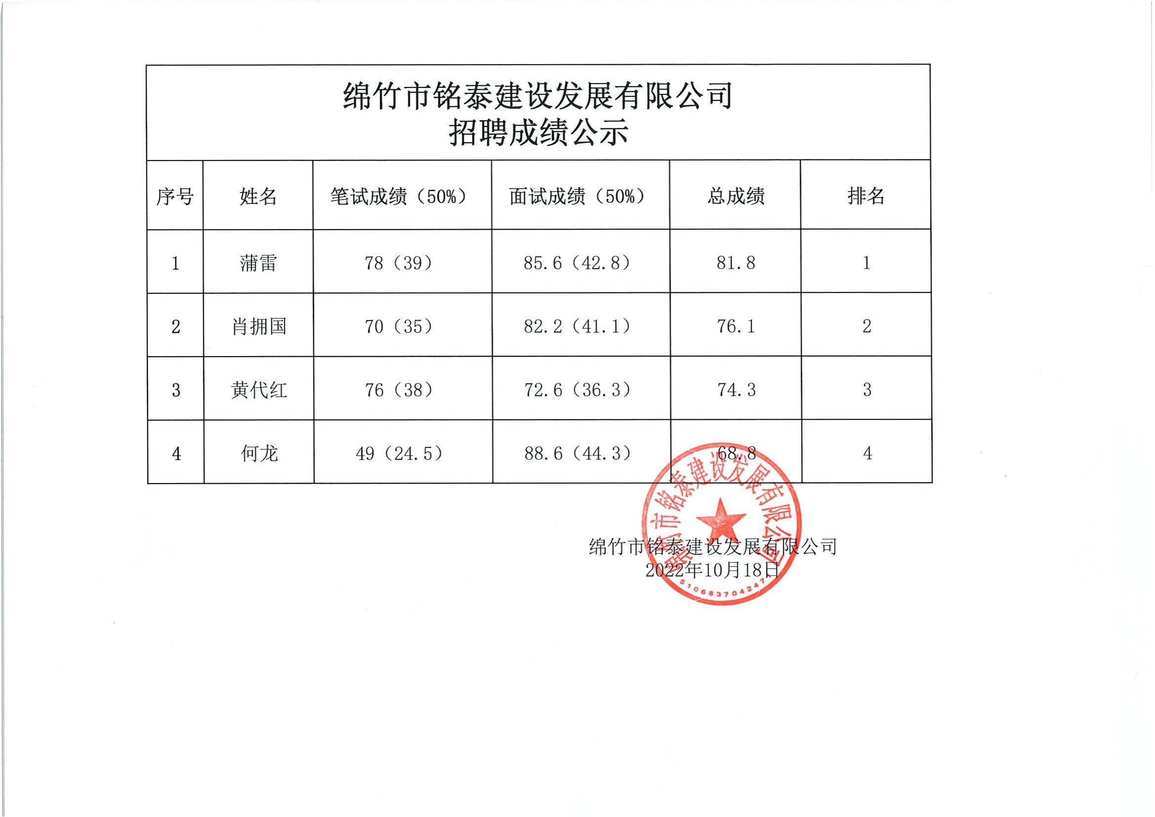 绵竹市铭泰建设发展有限公司招聘成绩公示