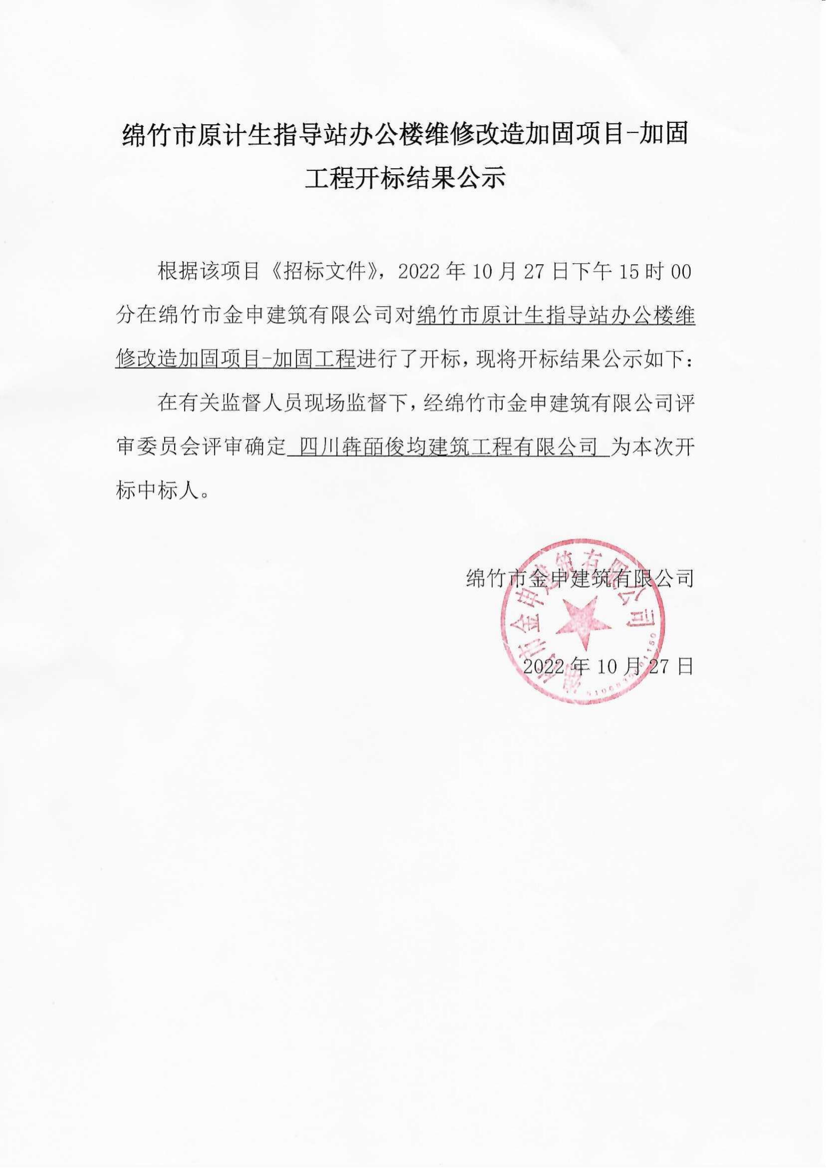 绵竹原计生指导站办公楼维修改造加固项目开标结果公告