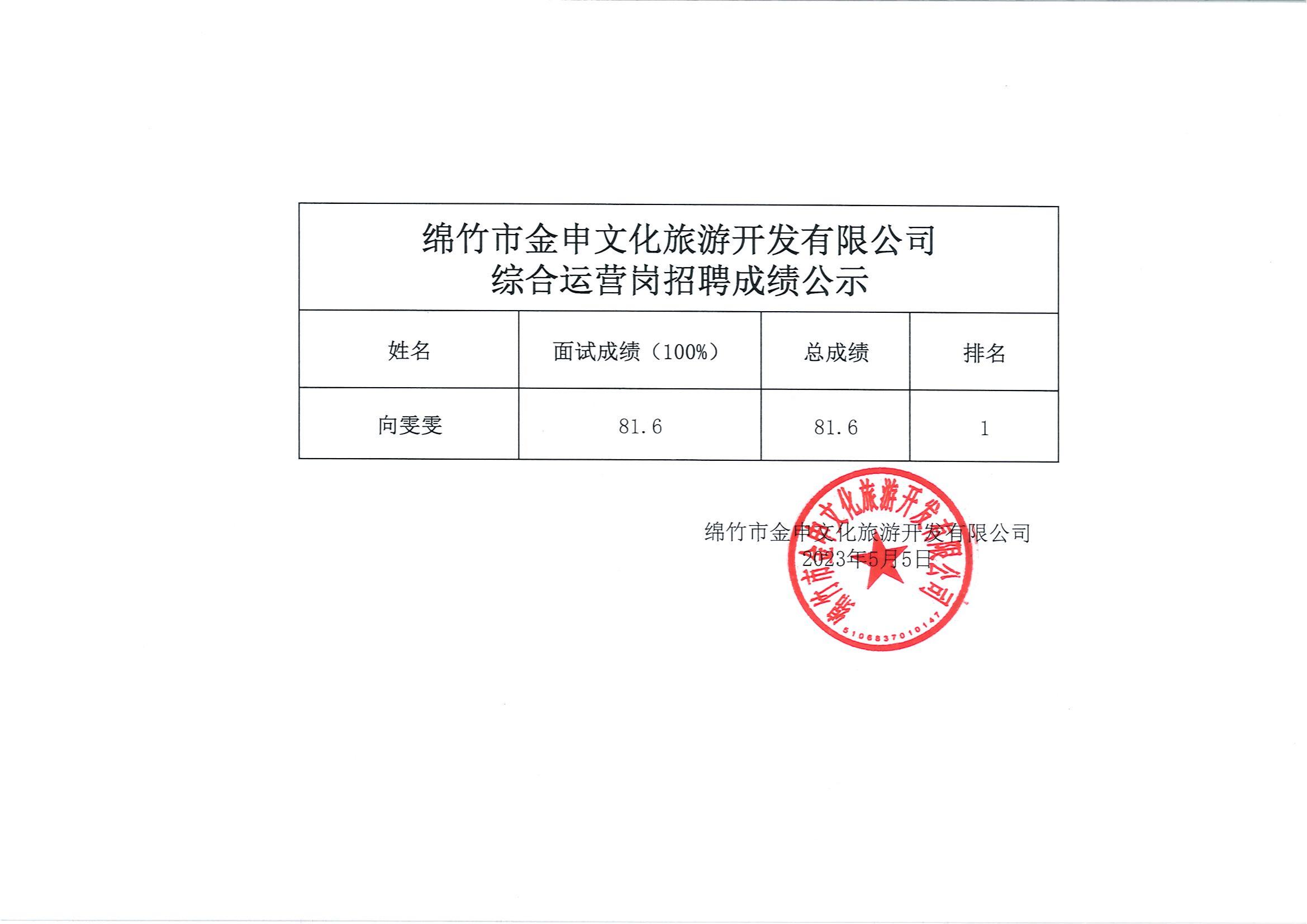 绵竹市金申文化旅游开发有限公司2023年招聘成绩公示