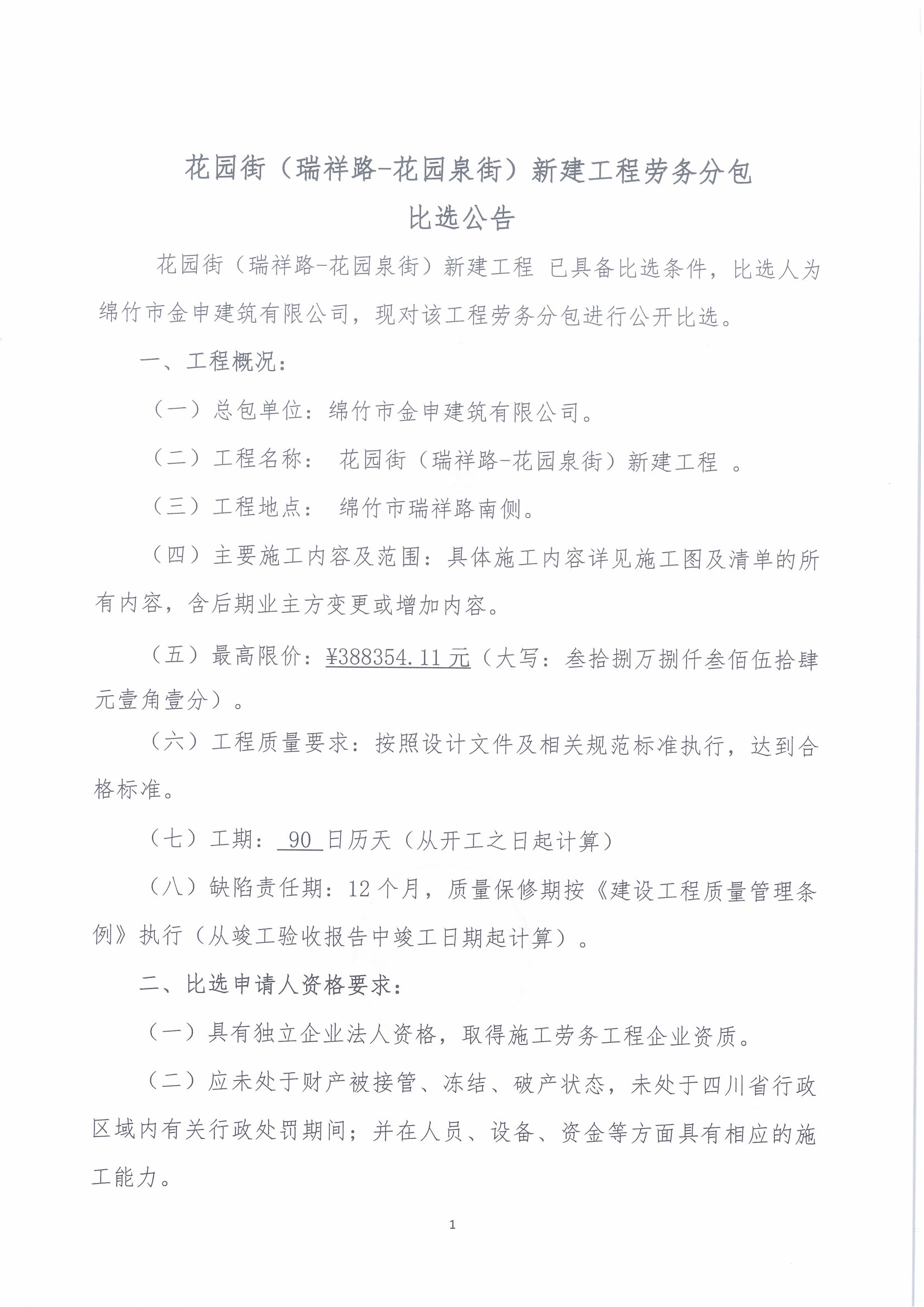 花园街(瑞祥路-花园泉街) 新建工程劳务分包比选公告