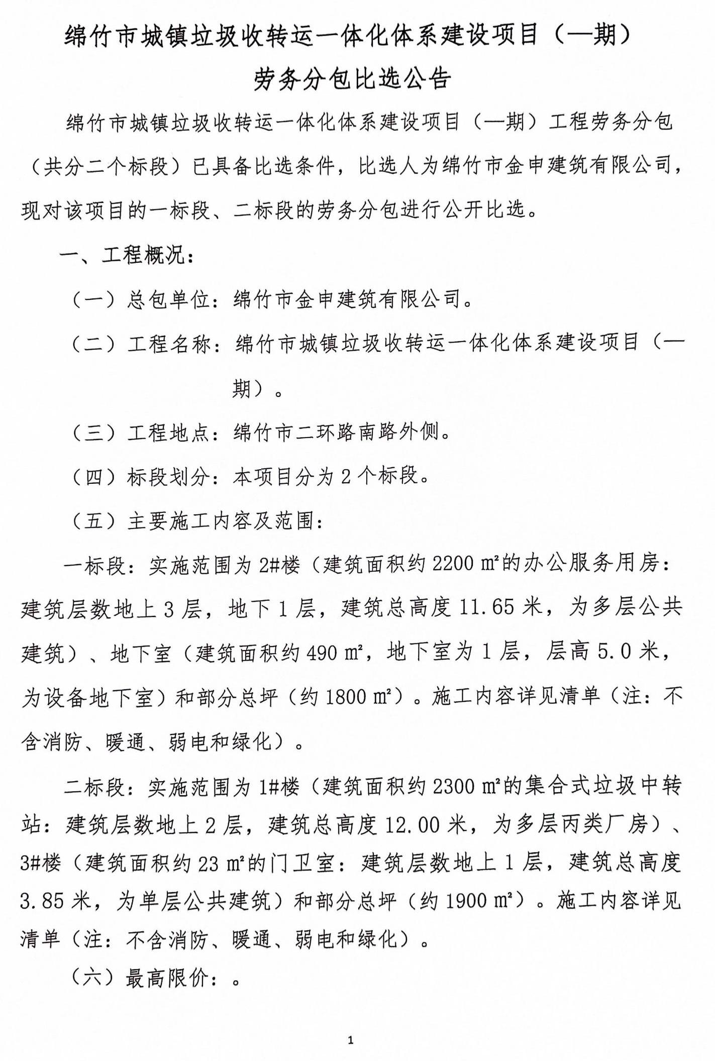 城镇垃圾收转运一体化建设项目(一期)劳务分包比选公告
