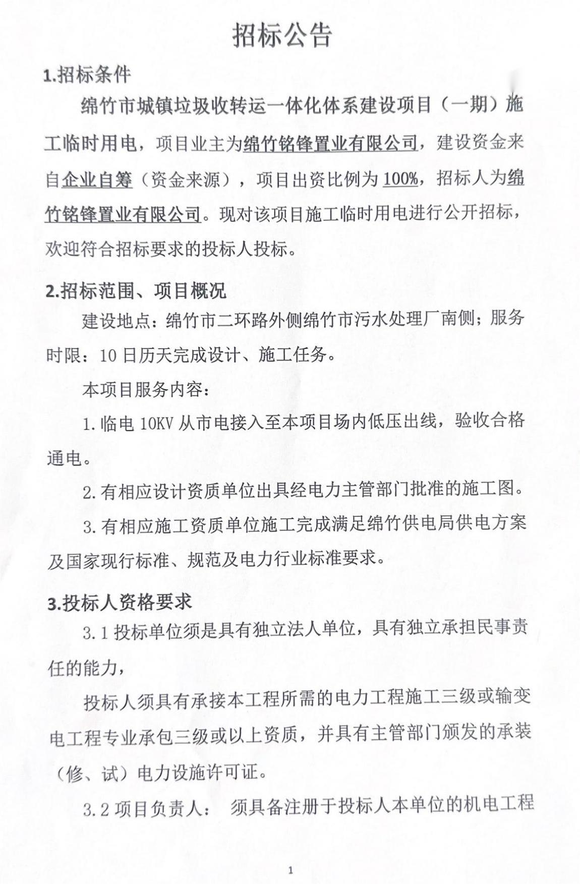 城镇垃圾收转运一体化建设项目(一期)临时用电招标公告