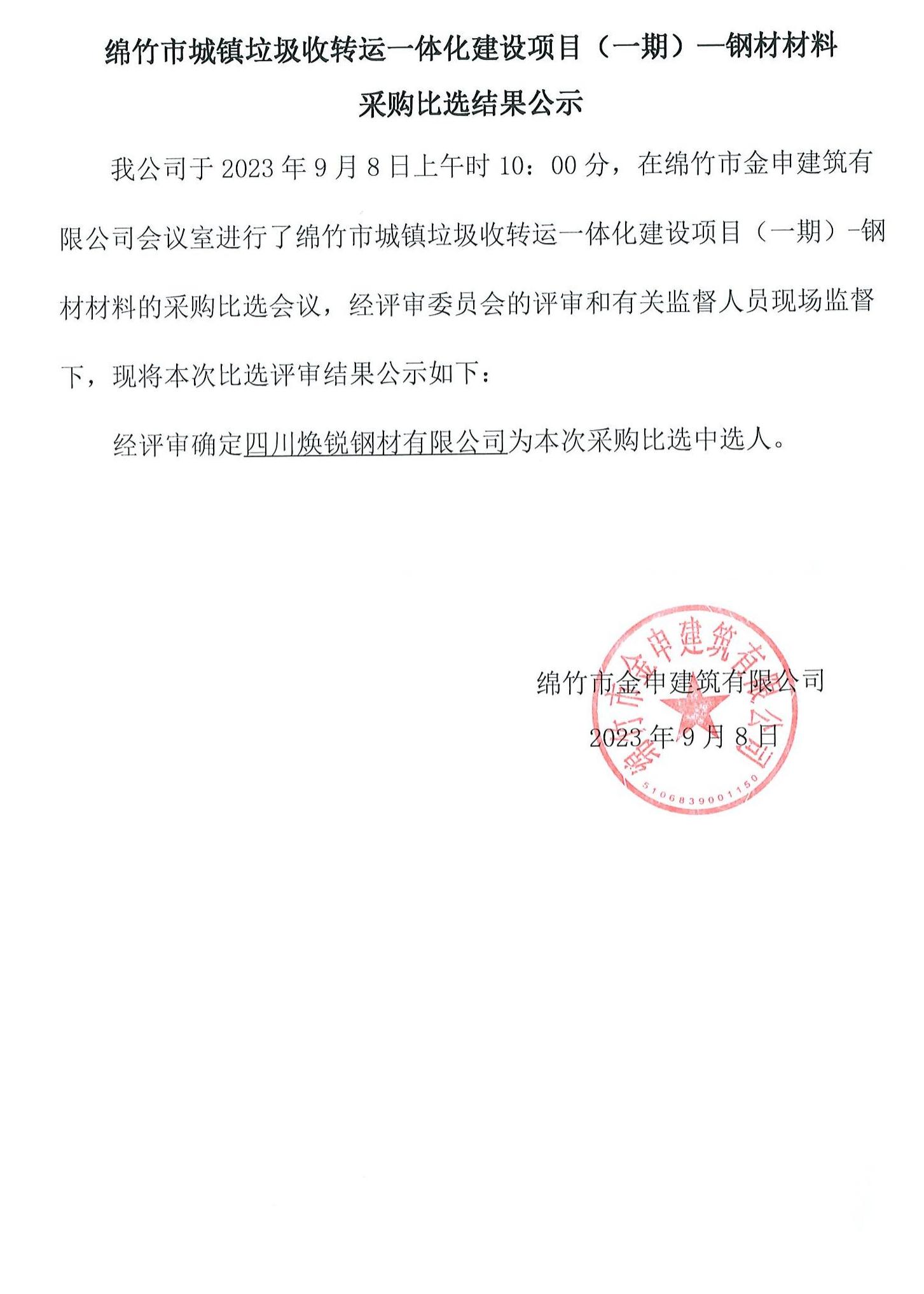 城镇垃圾收转运一体化建设项目(一期)—钢材结果公示