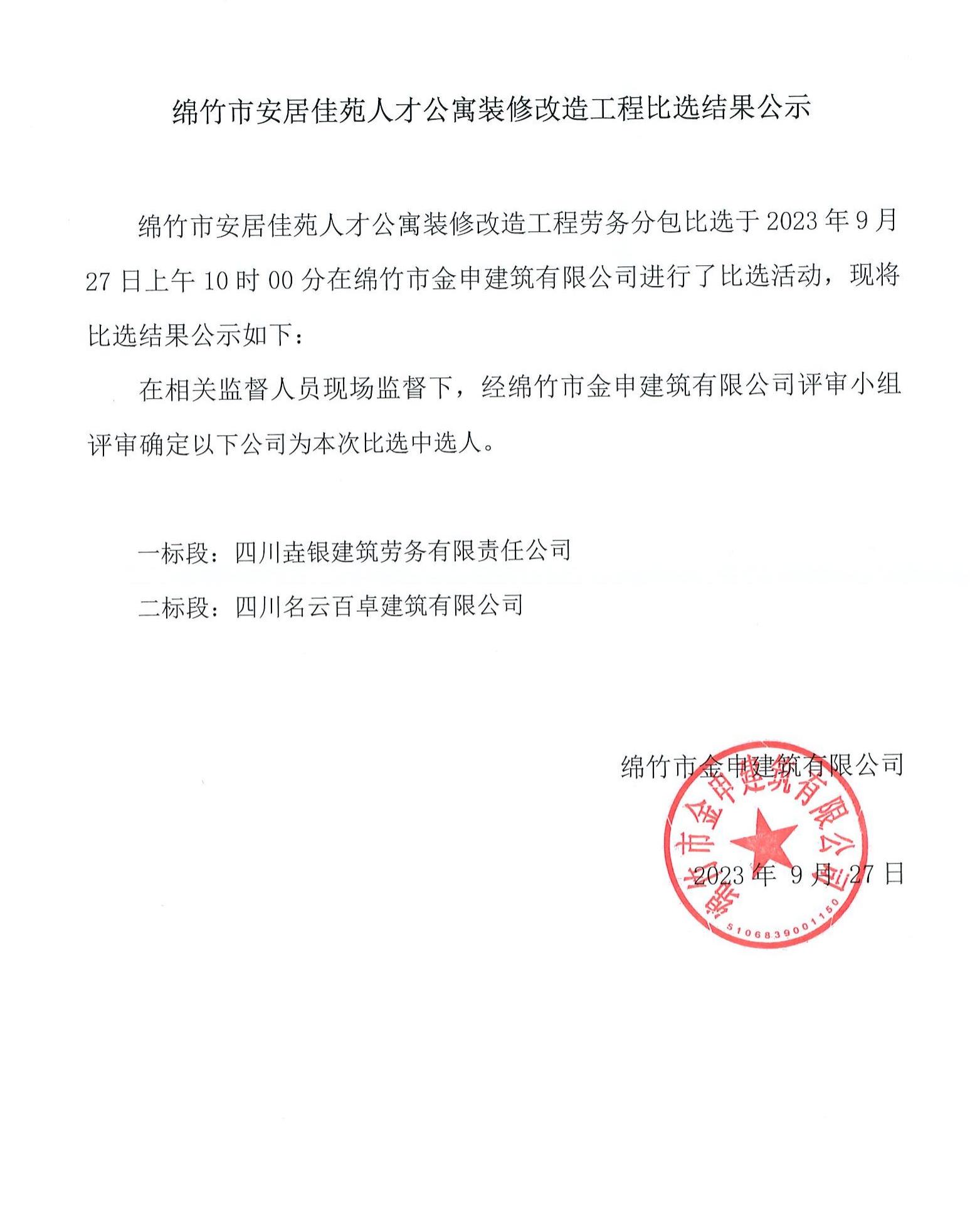 绵竹市安居佳苑人才公寓装修改造工程比选结果公示