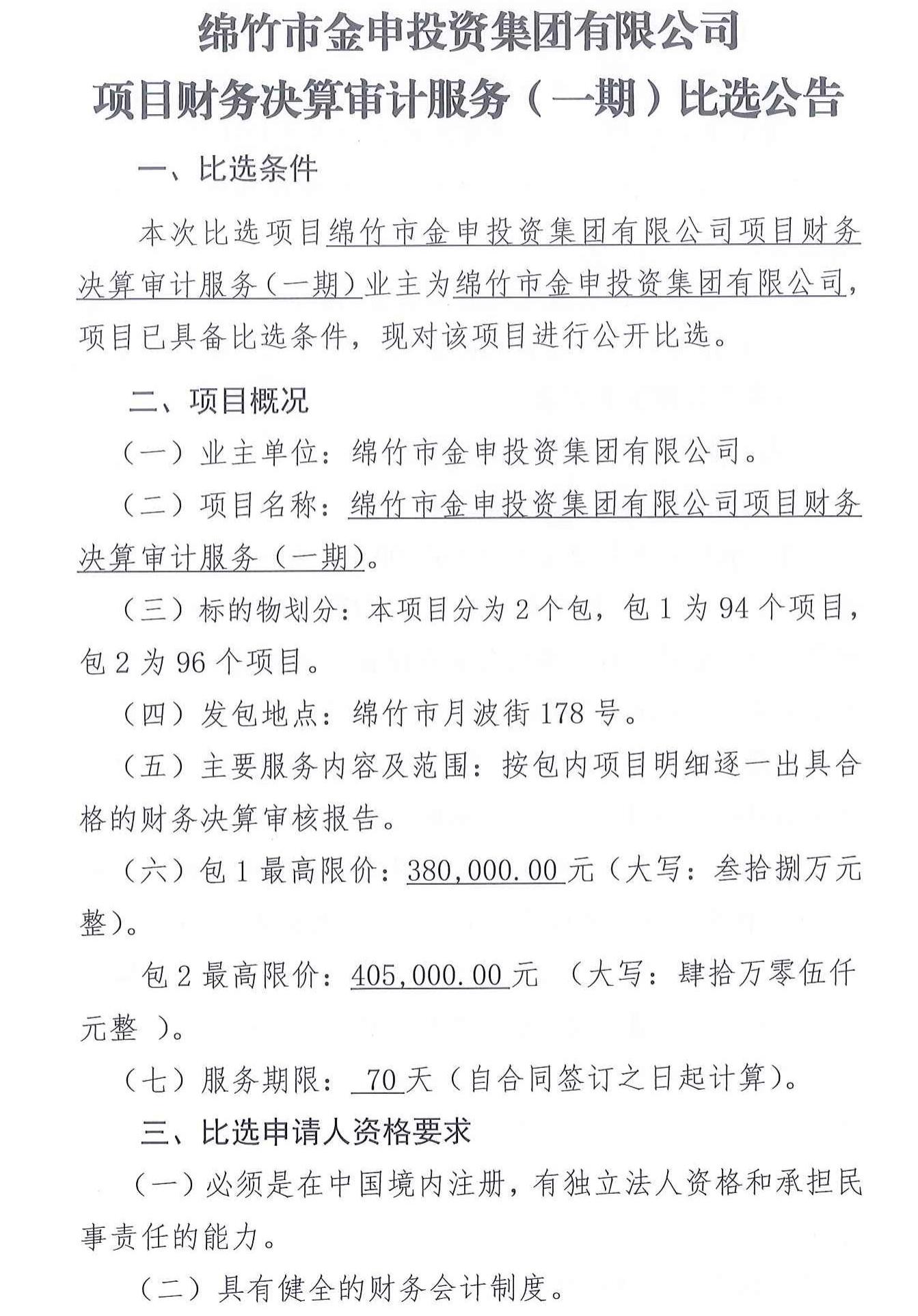 金申投资集团有限公司财务决算审计服务(一期)比选公告