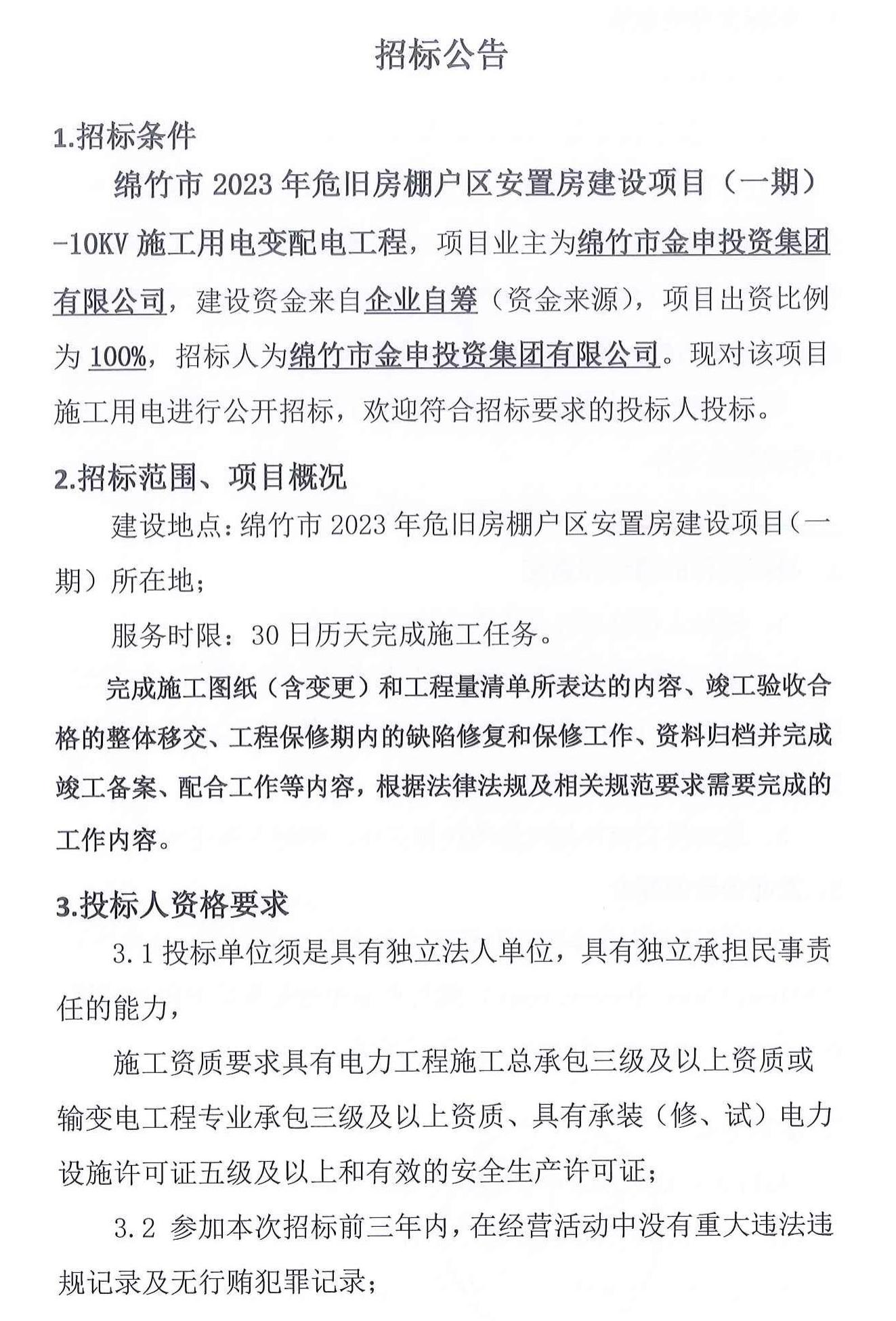 绵竹市2023年危旧房棚户区安置房(一期)变配电招标公告