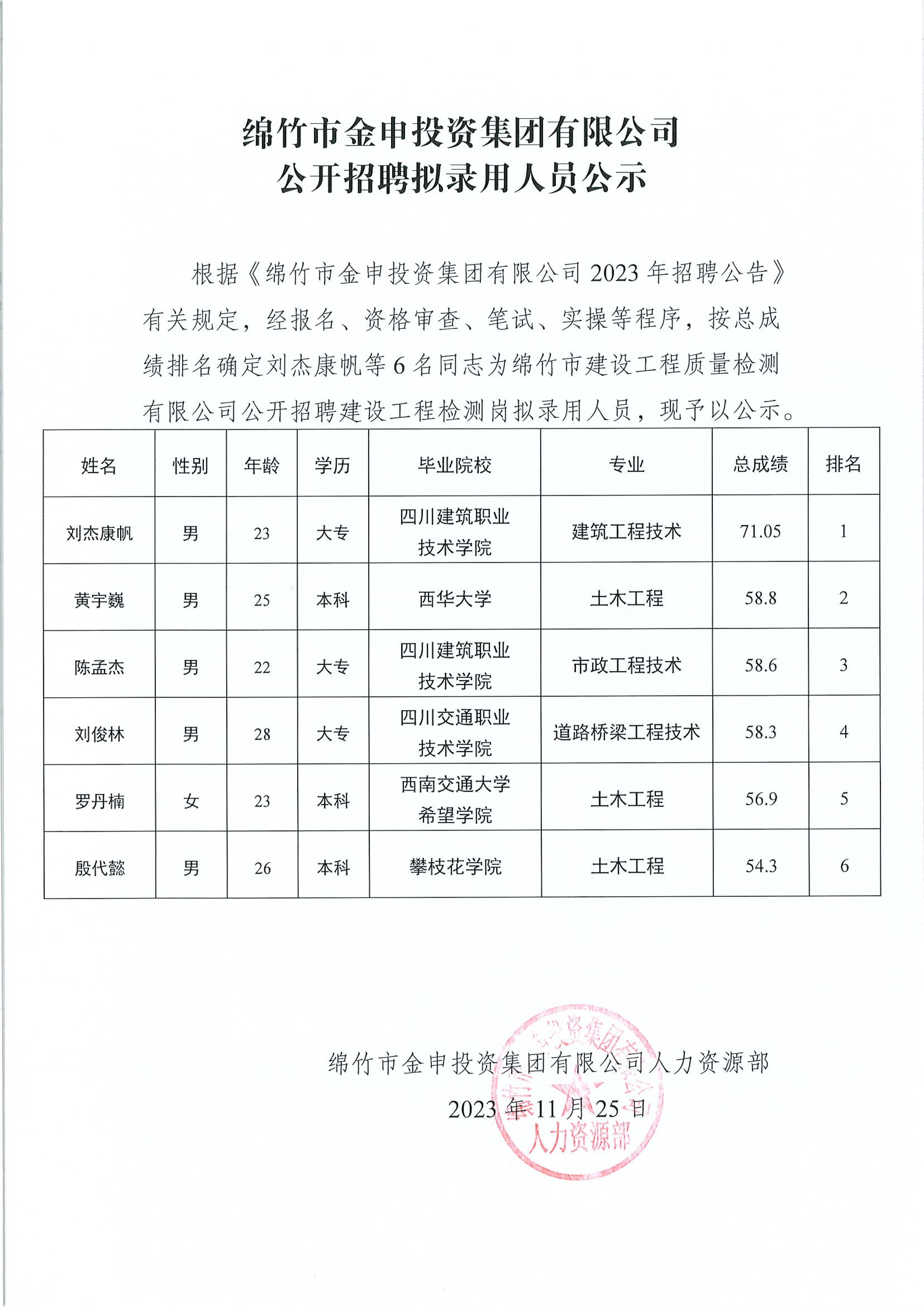 绵竹市金申投资集团有限公司公开招聘拟录用人员公示