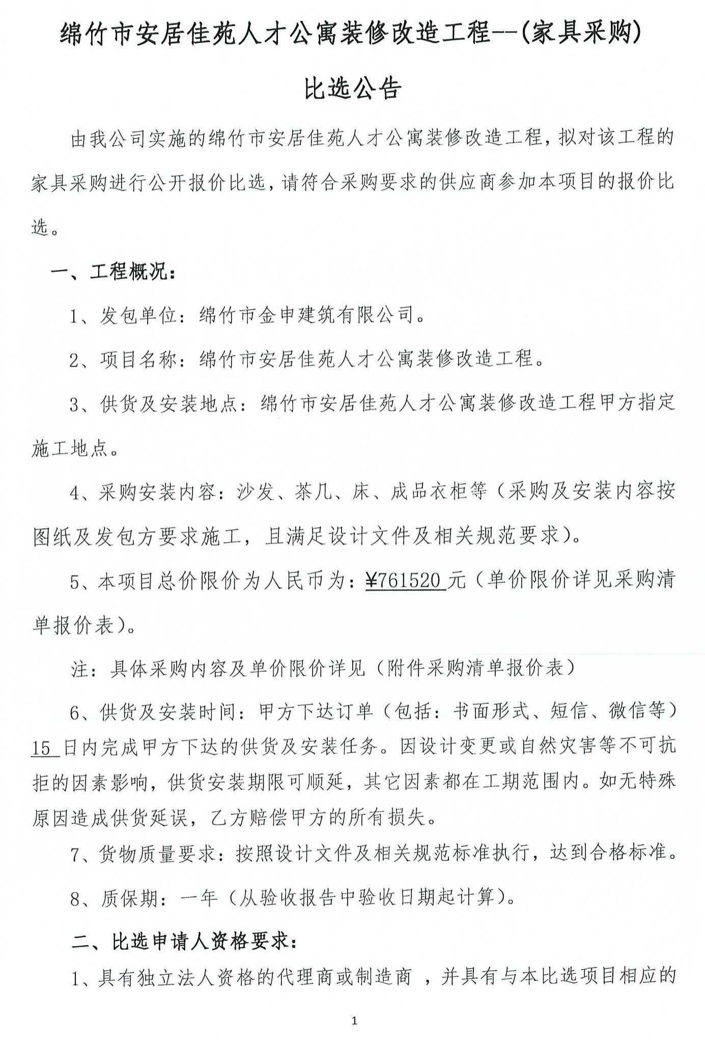 绵竹安居佳苑人才公寓装修改造工程(家具采购)比选公告