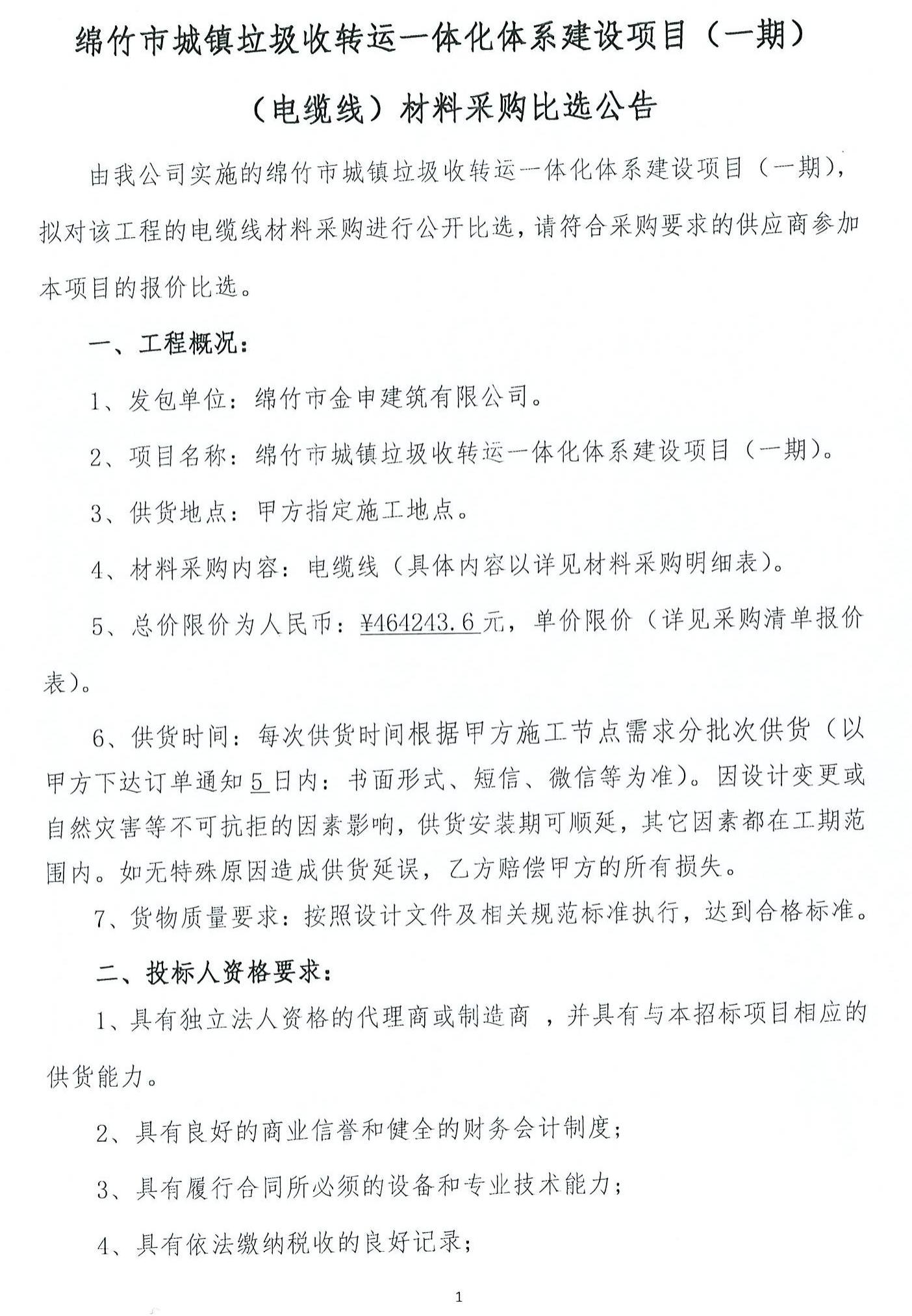 城镇垃圾收转运一体化建设项目(一期)电缆线招标公告