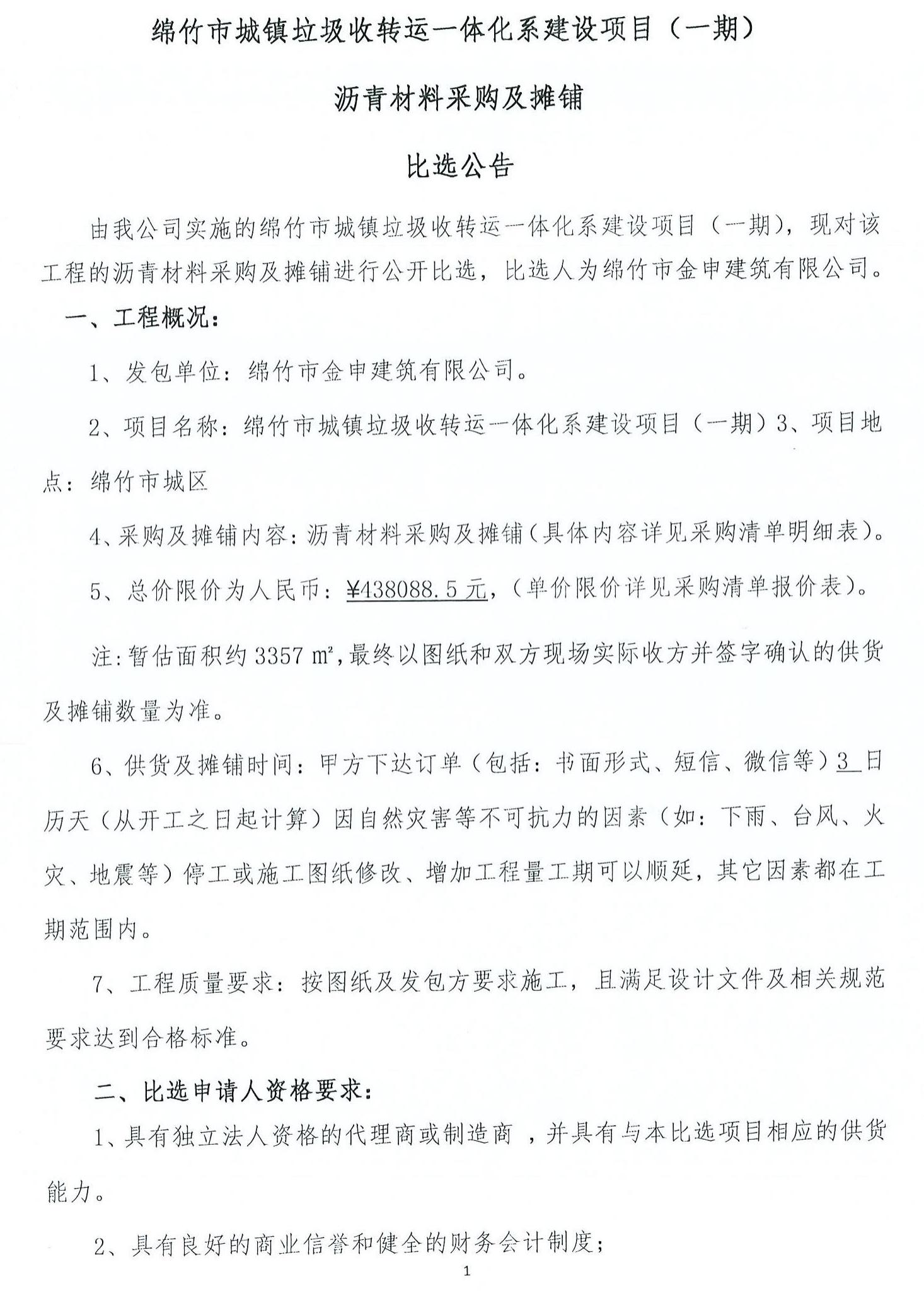 城镇垃圾收转运一体化建设(一期)沥青材料采购比选公告