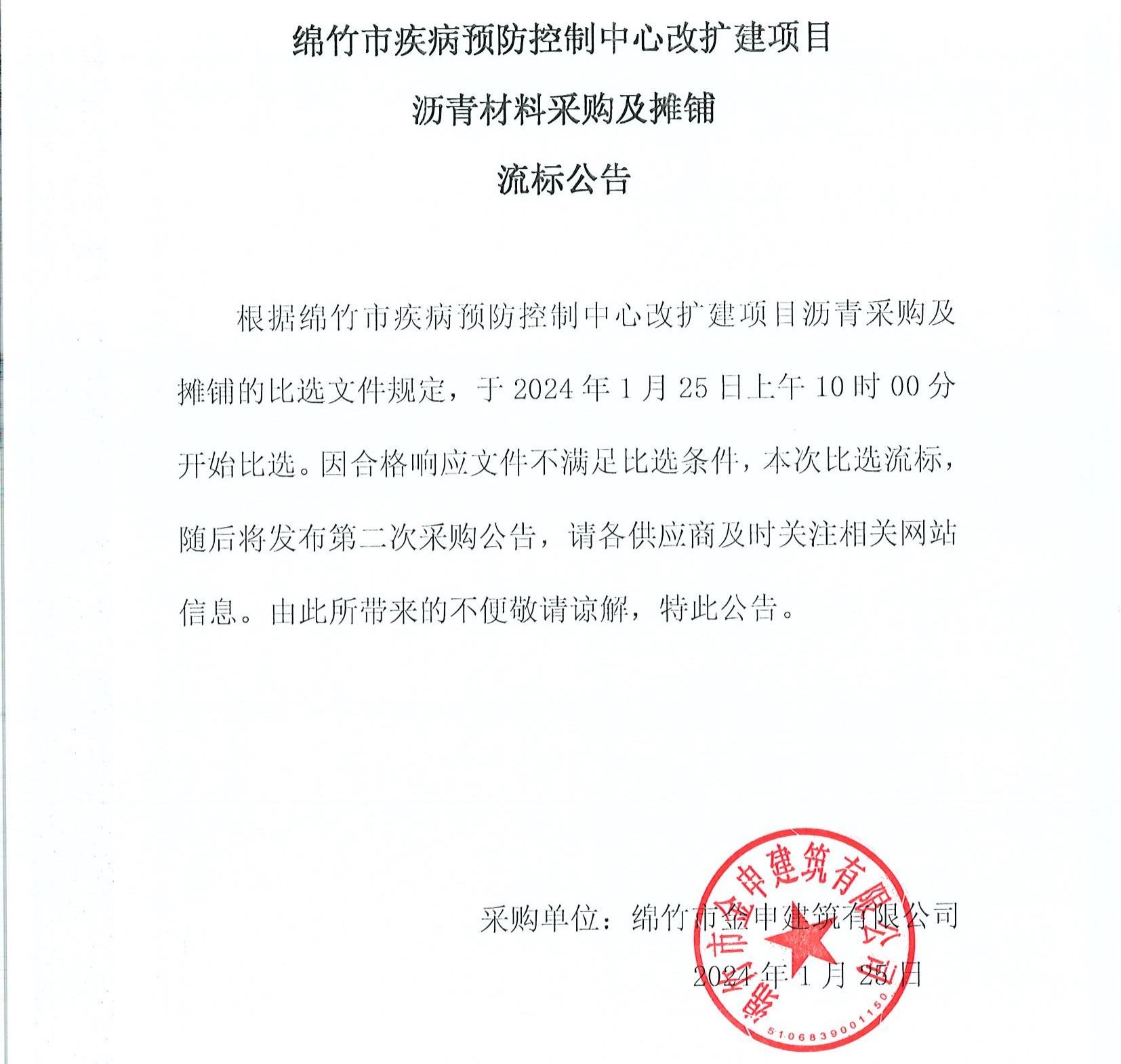绵竹市疾病预防控制中心改扩建项目沥青材料采购流标公告