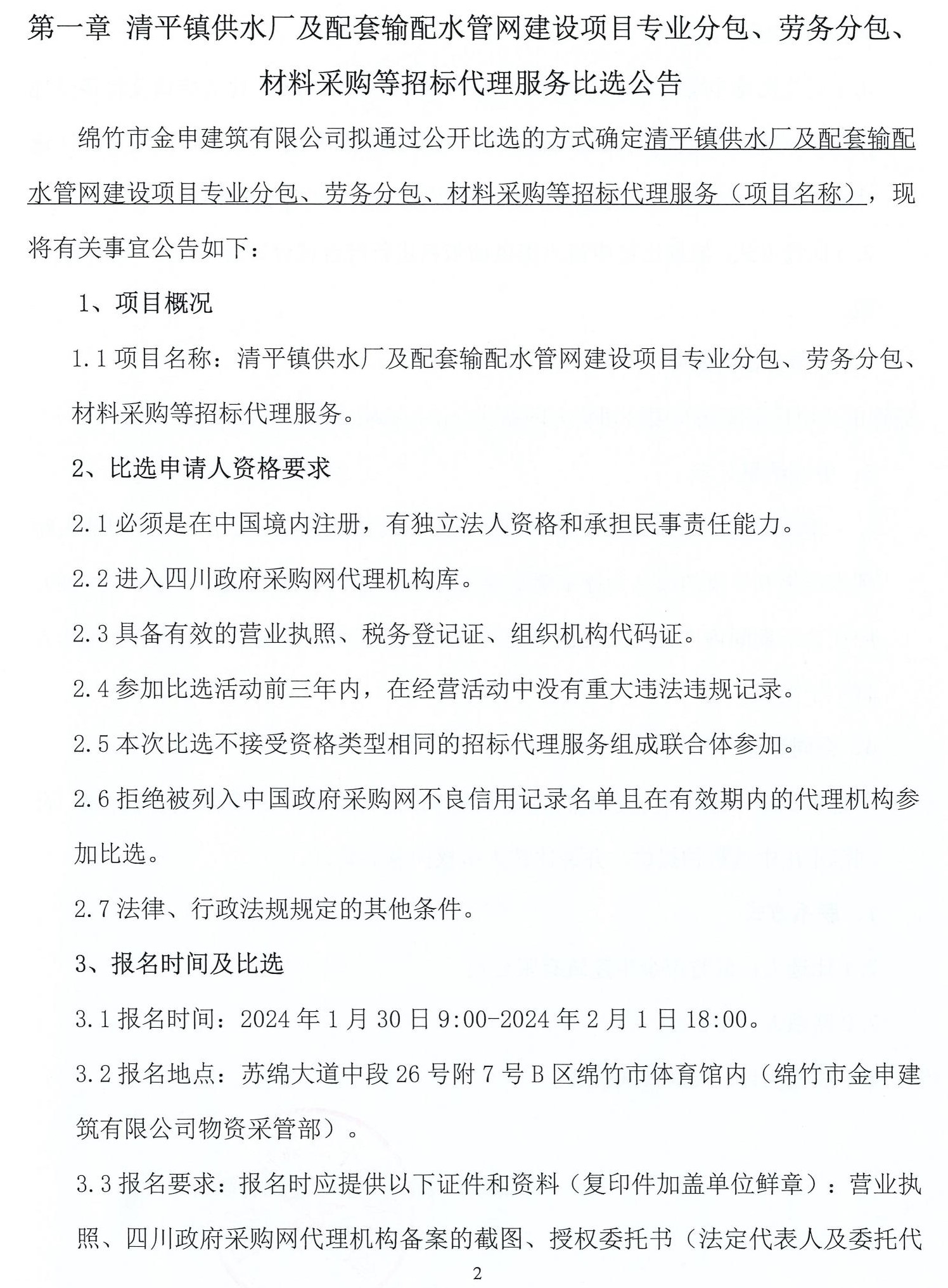 清平镇供水厂及配套输配水管网建设分包项目招标比选公告