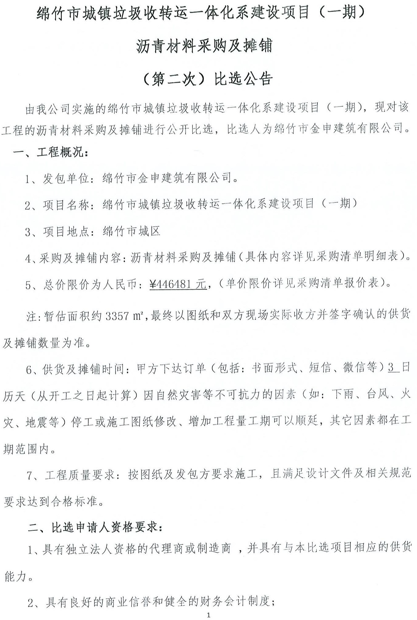 城镇垃圾收转运一体化(一期)沥青材料第二次比选公告