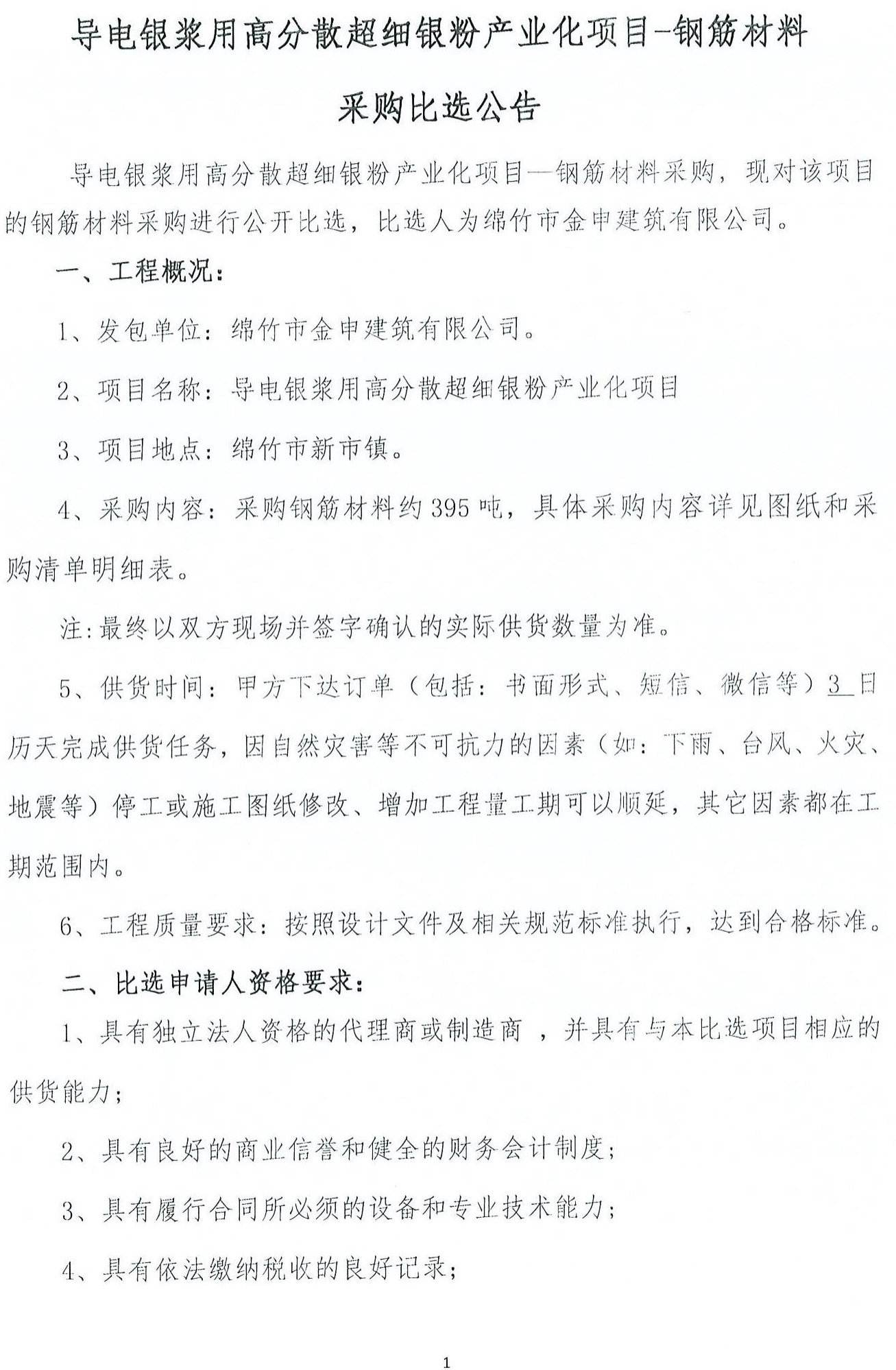 导电银浆用高分散超细银粉项目钢筋材料采购比选公告