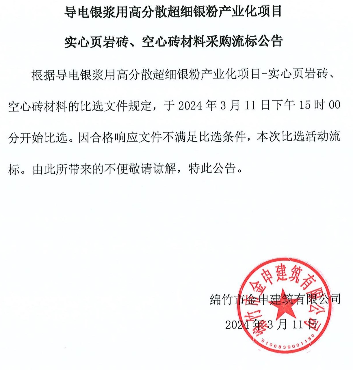 导电银浆用高分散超细银粉项目页岩砖、空心砖流标公告