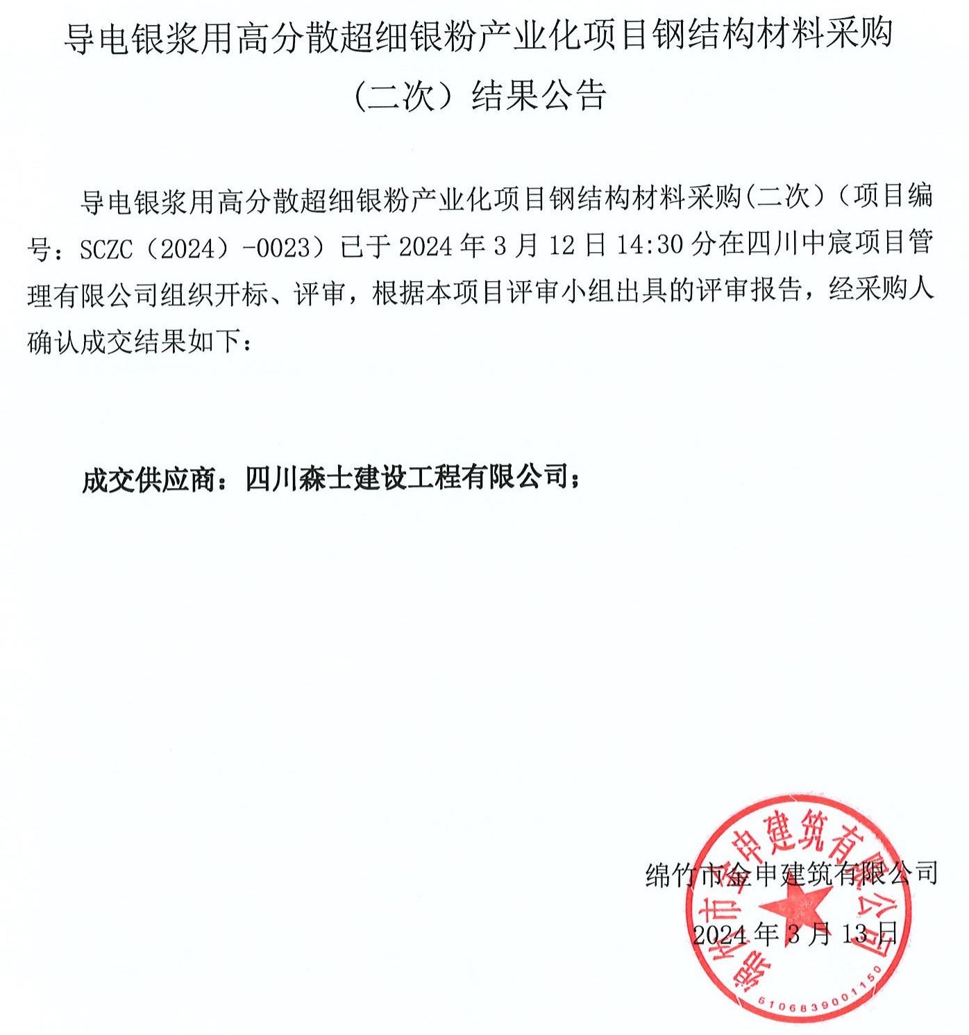 导电银浆用高分散超细银粉钢结构(第二次)采购结果公示