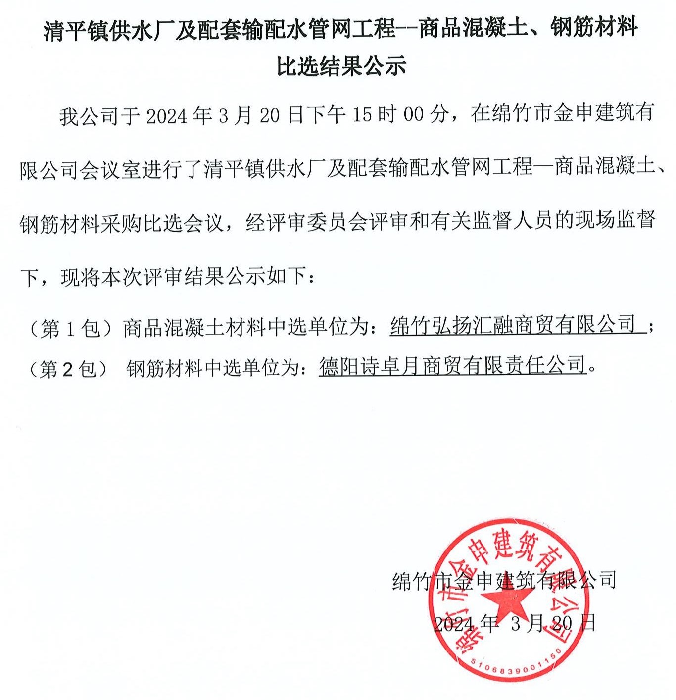 清平镇供水厂及配套输配水管网商品混凝土、钢筋结果公示
