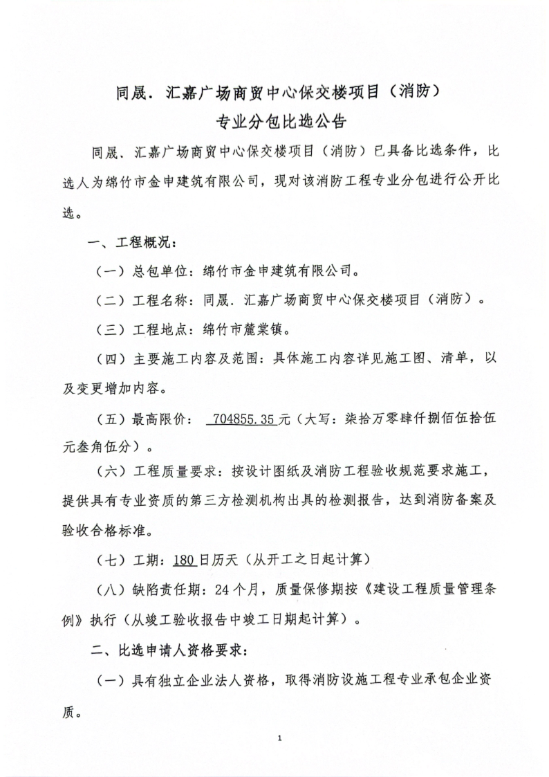 同晟汇嘉广场商贸中心保交楼(消防)专业分包比选公告