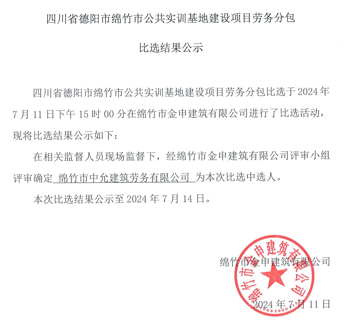 绵竹市公共实训基地建设项目劳务分包结果公示