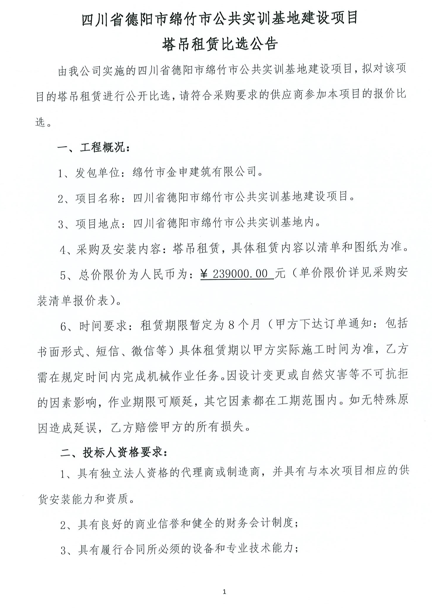 绵竹市公共实训基地建设项目塔吊租赁比选公告
