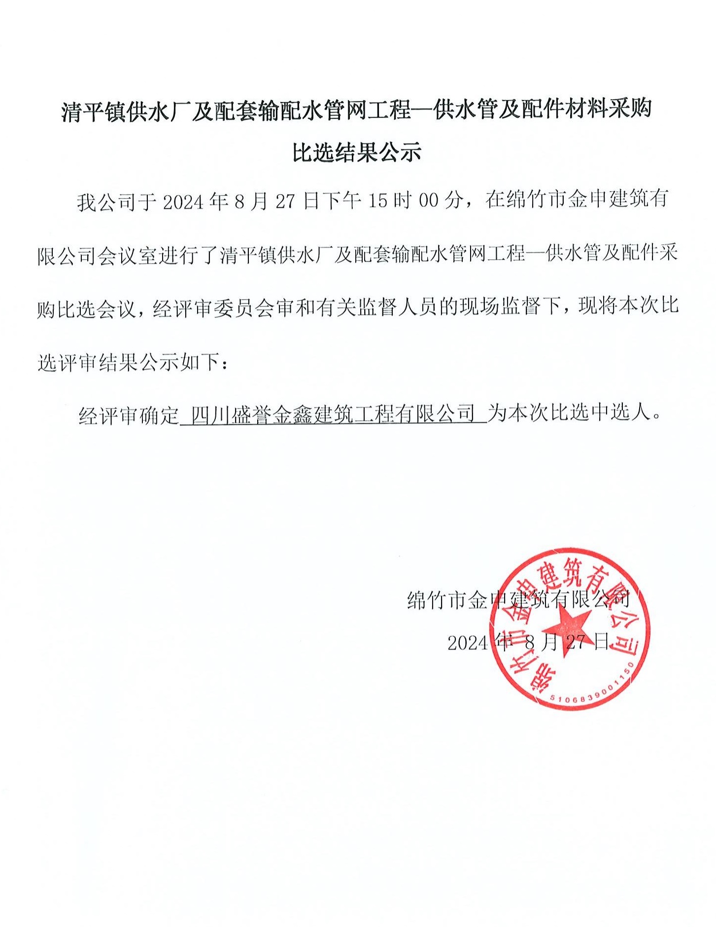 清平镇供水厂及配套输配水管网工程采购比选结果公示