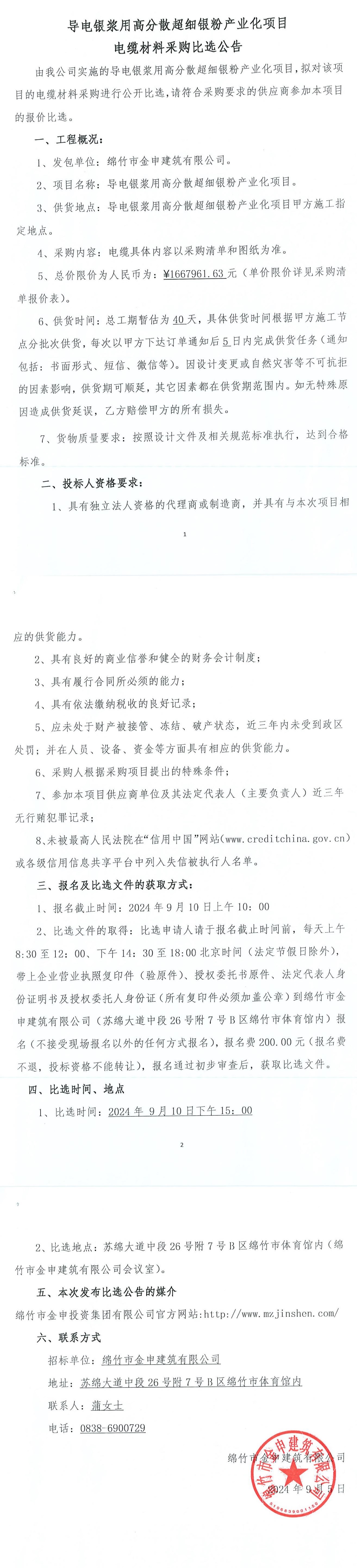 导电银浆用高分散超细银粉产业化项目电缆材料采购公告