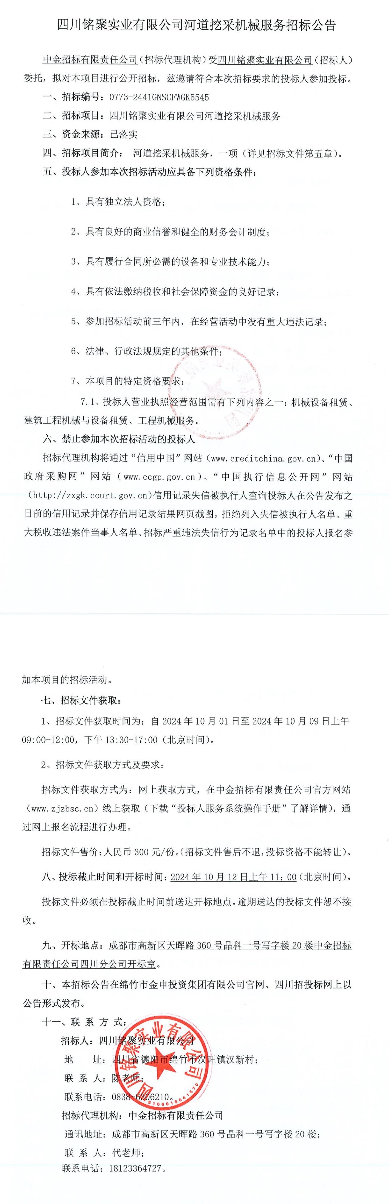 四川铭聚实业有限公司河道挖采机械服务招标公告
