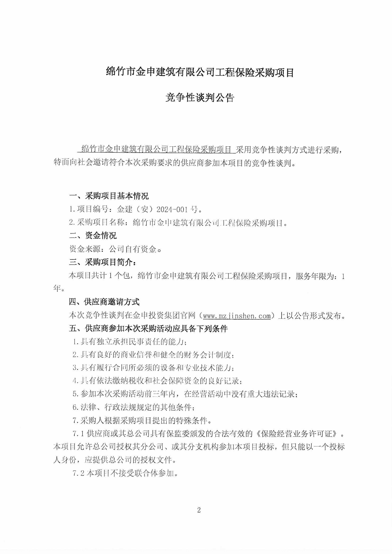 绵竹市金申建筑有限公司工程保险采购项目竞争性谈判公告