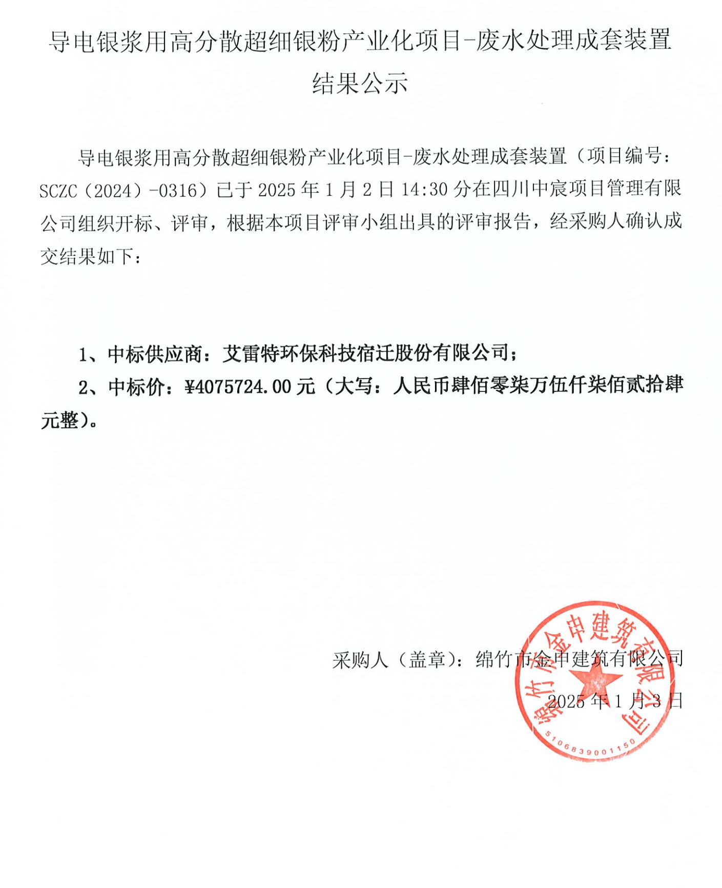 导电银浆用高分散超细银粉产业化-废水处理招标结果公示