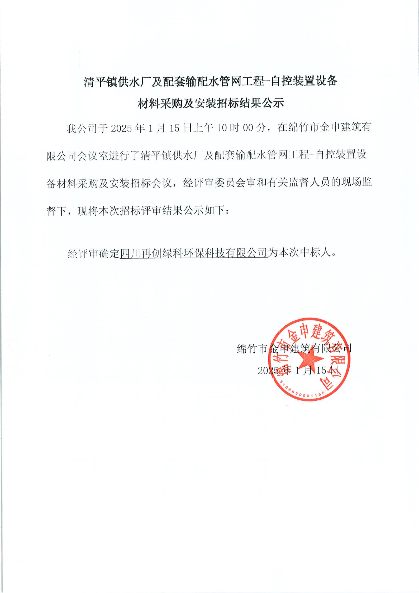 清平镇供水厂及配套输配水管网自控设备招标结果公示