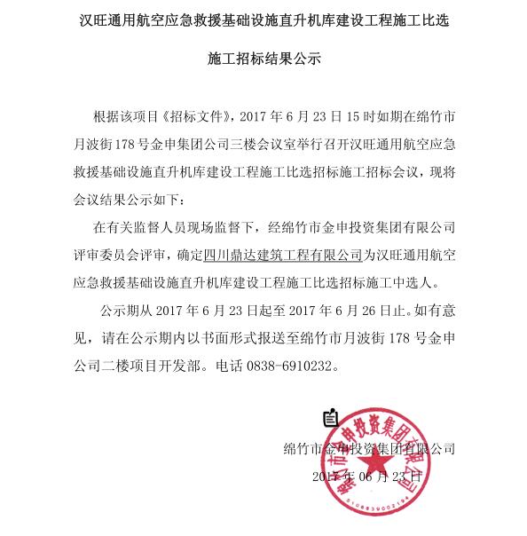 汉旺通用航空应急救援直升机库工程施工比选招标结果公示
