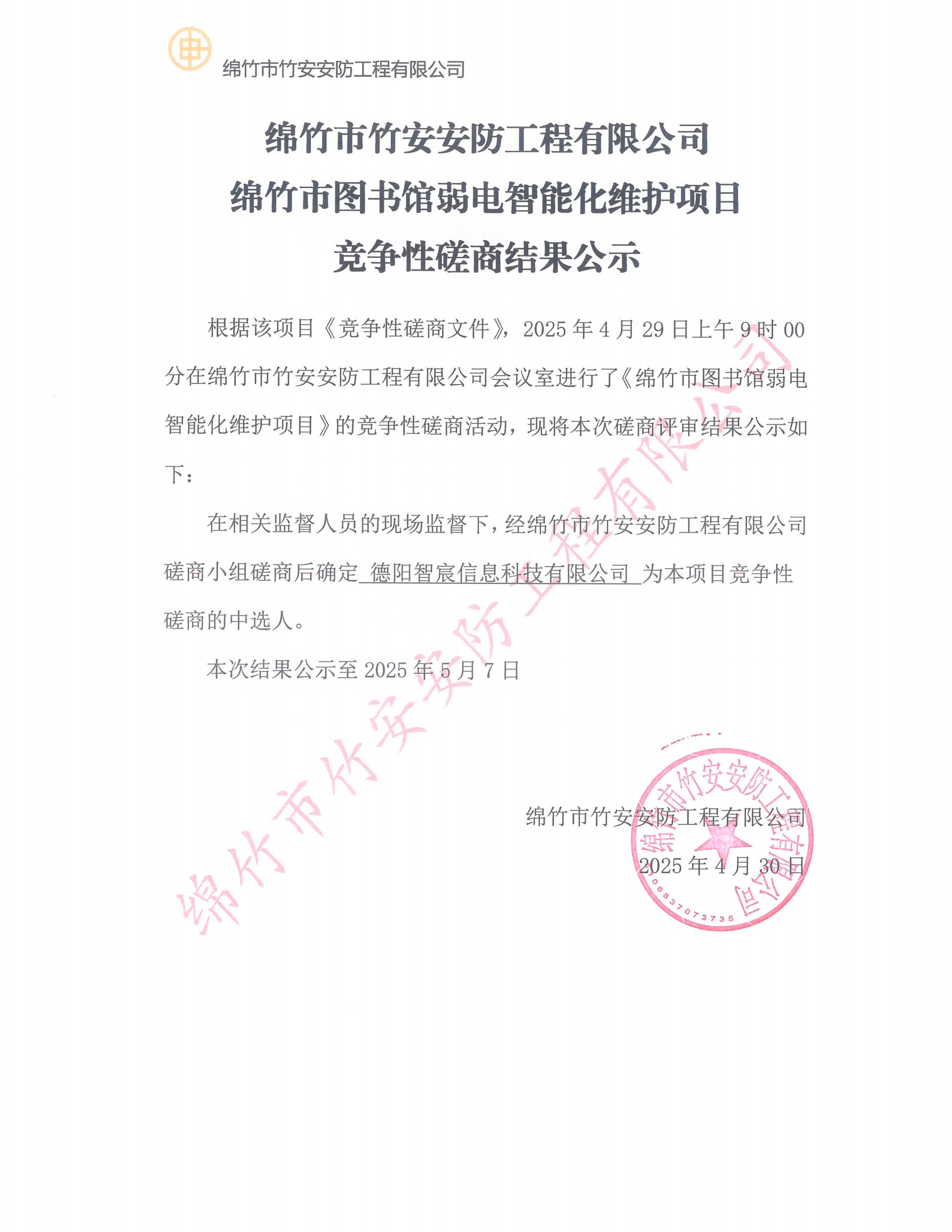 绵竹市图书馆弱电智能化维护项目竞争性磋商结果公示
