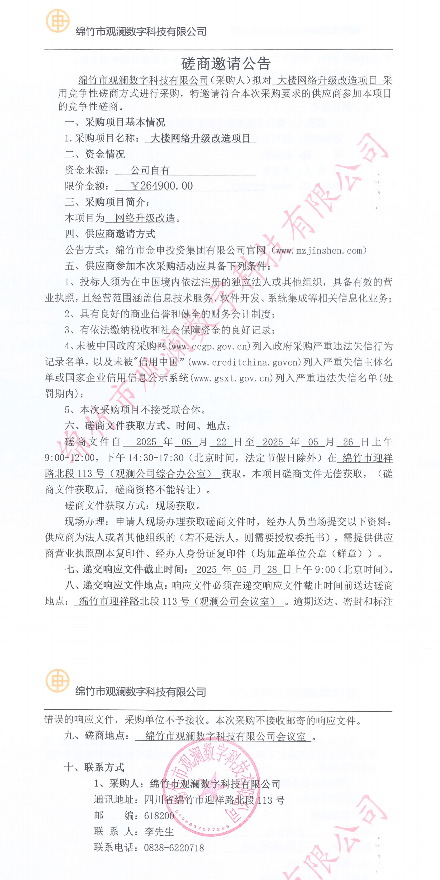 绵竹市观澜数字科技有限公司磋商邀请公告