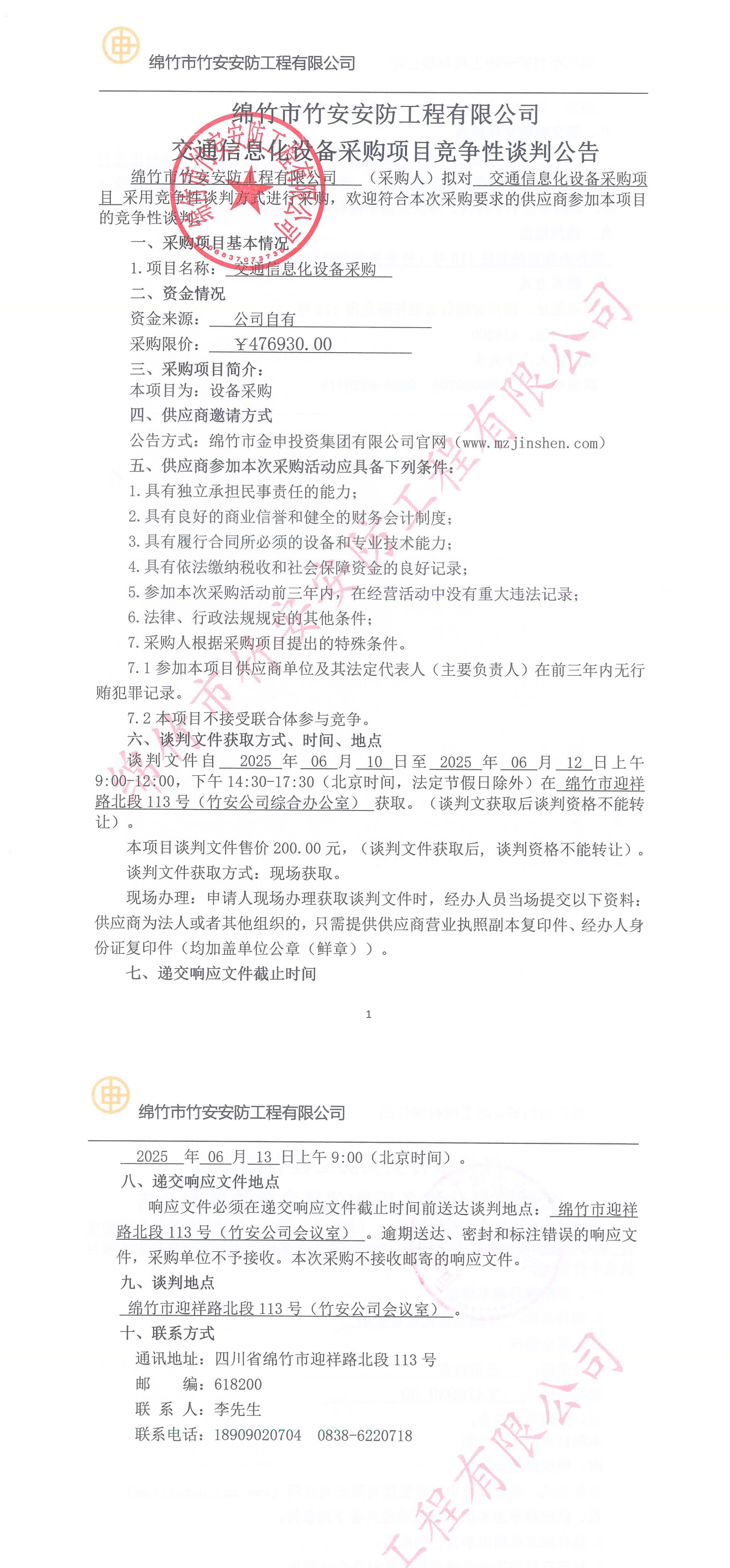 竹安安防关于交通信息化设备采购项目竞争性谈判公告