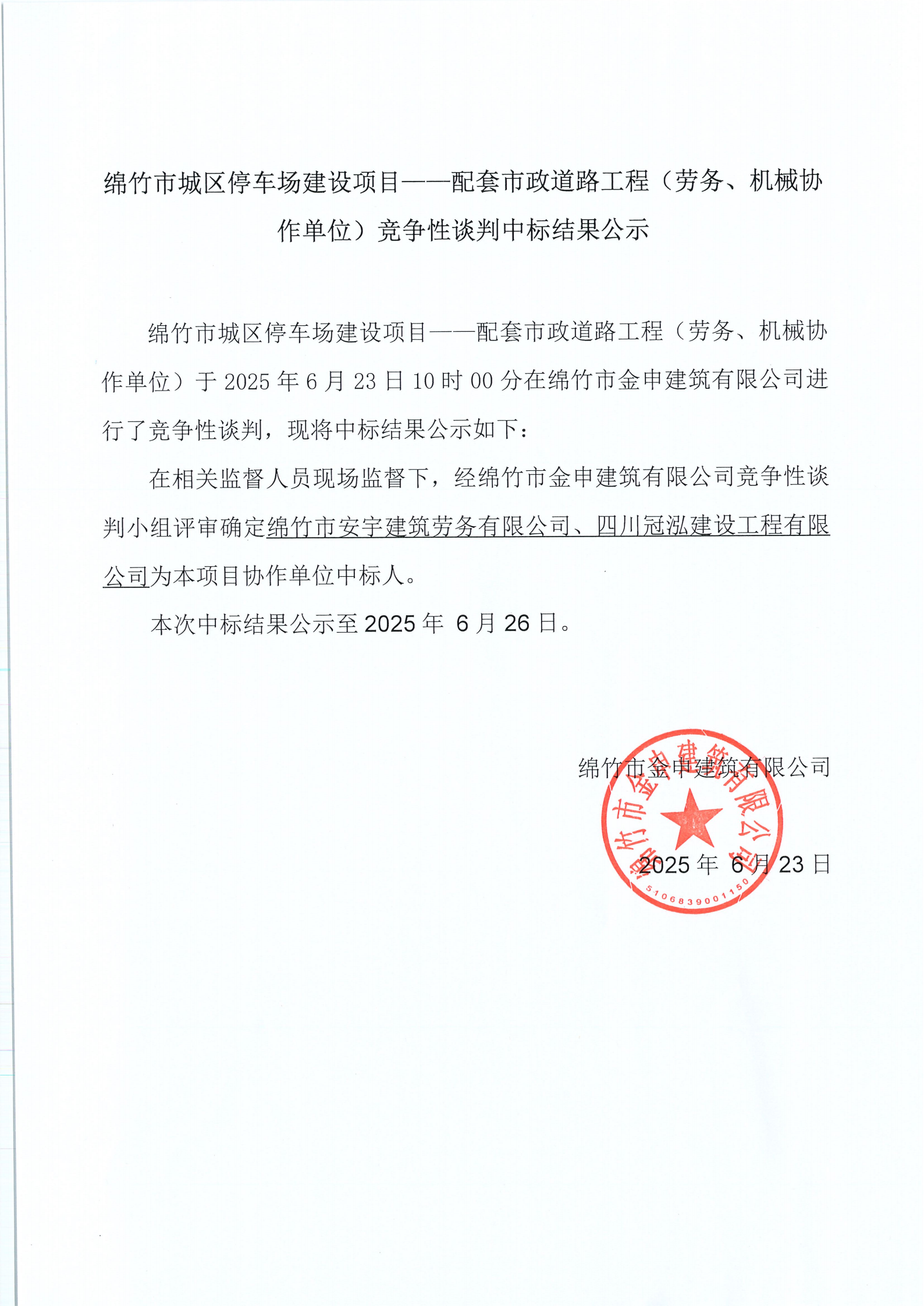 绵竹市城区停车场建设项目--配套市政道路工程中标结果公示