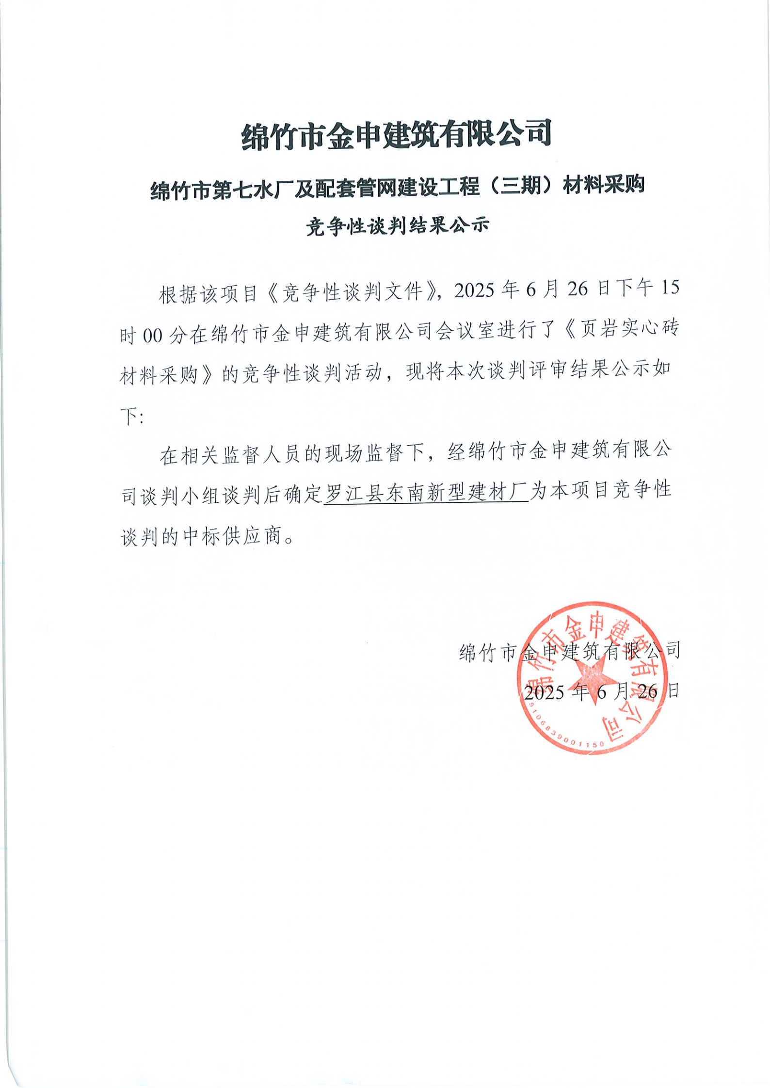 七水厂及配套管网建设工程-页岩实心砖招标结果公示