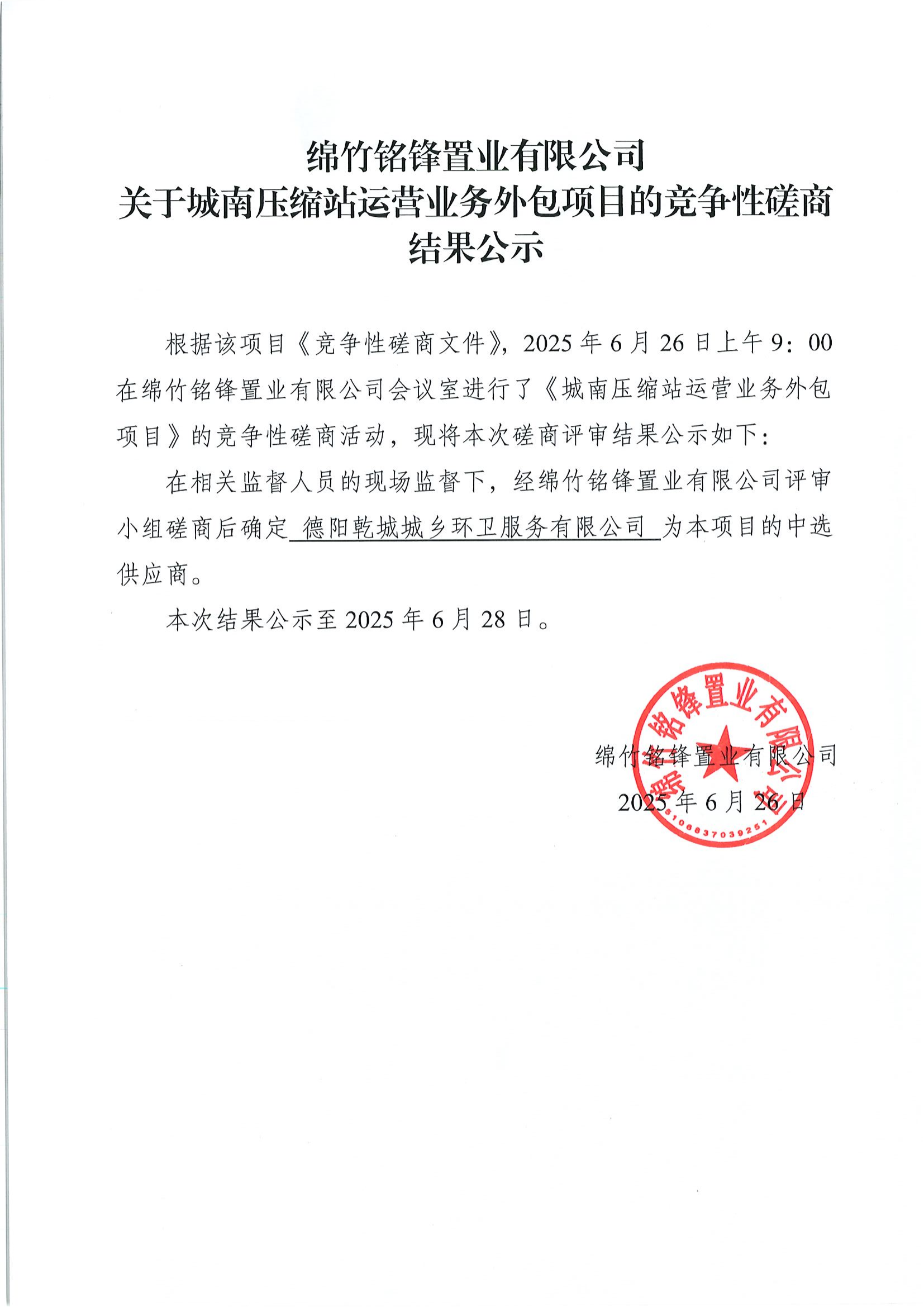 关于城南压缩站运营业务外包项目的竞争性磋商结果公示
