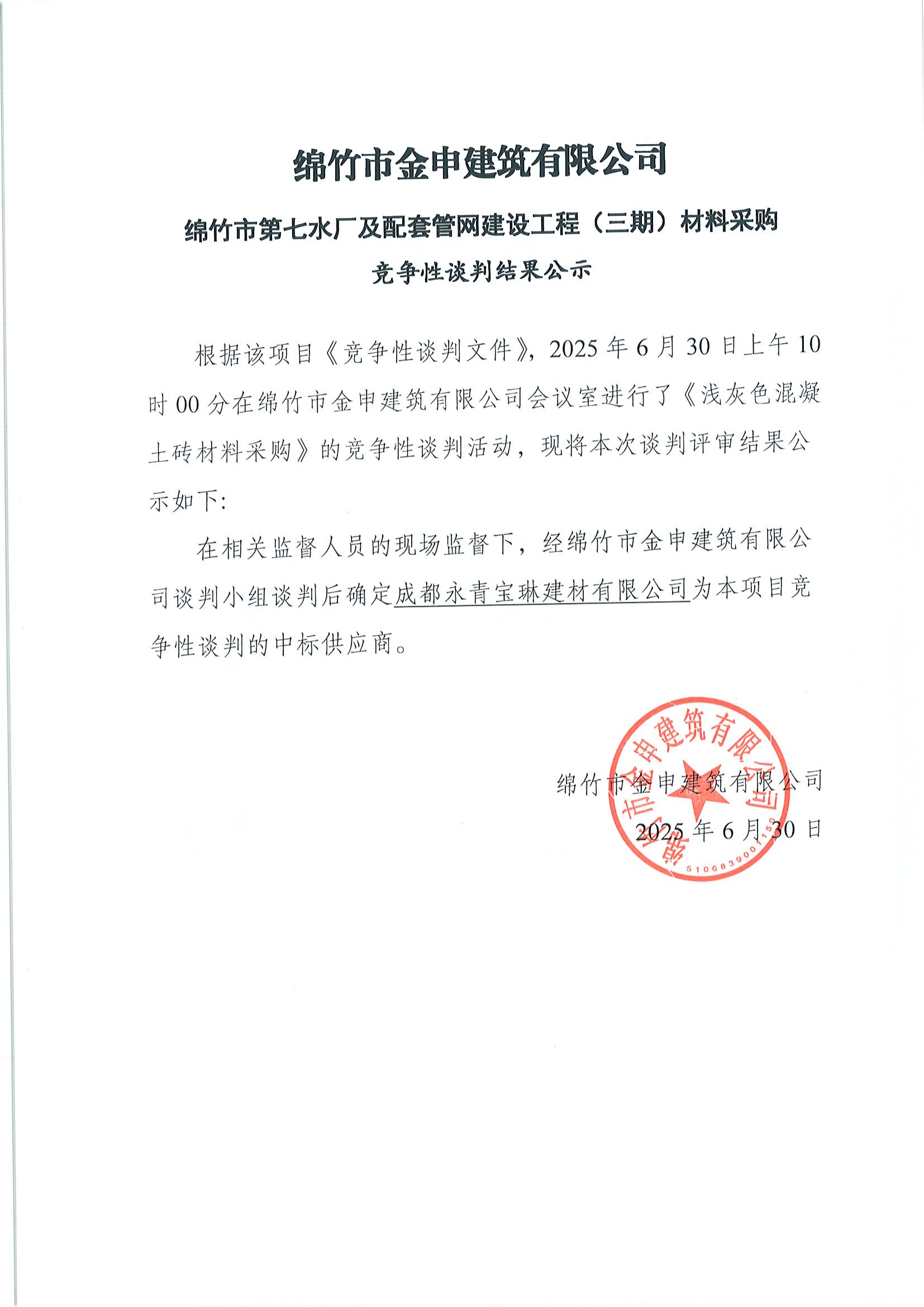 七水厂及配套管网建设工程(三期)材料中标结果公示