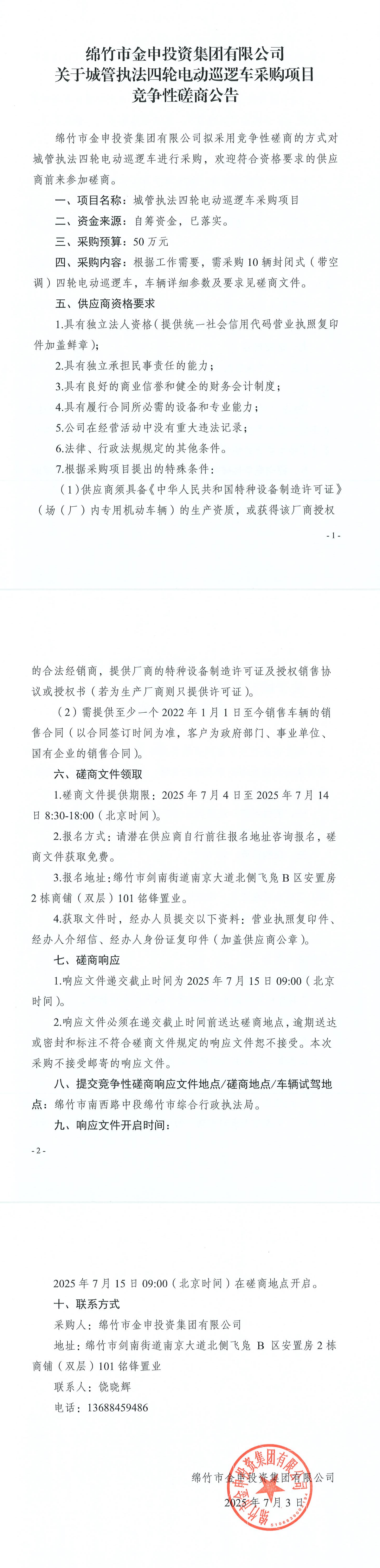 关于城管执法四轮电动巡逻车采购项目竞争性磋商公告