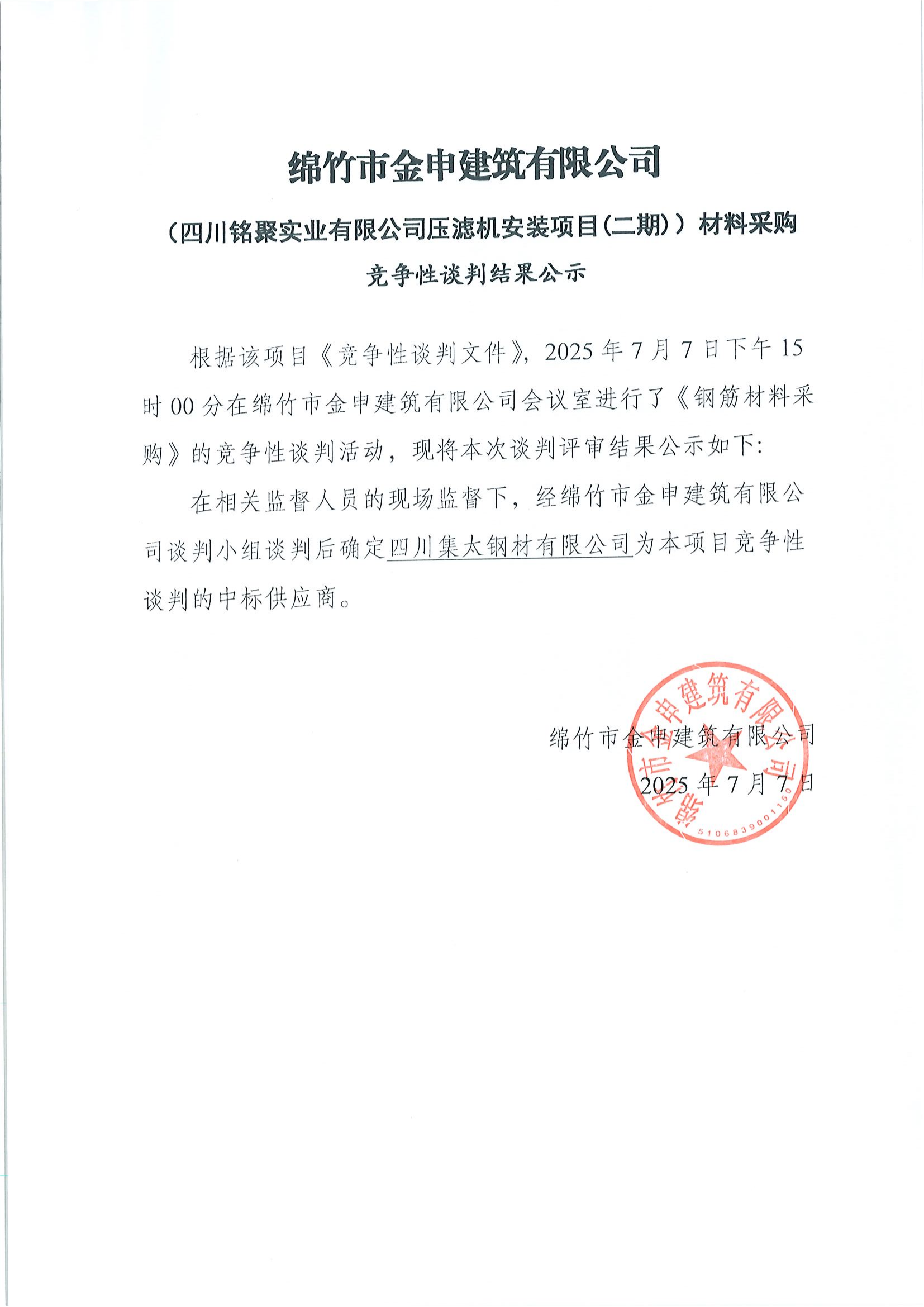 铭聚实业有限公司项目(钢筋)材料中标结果公示