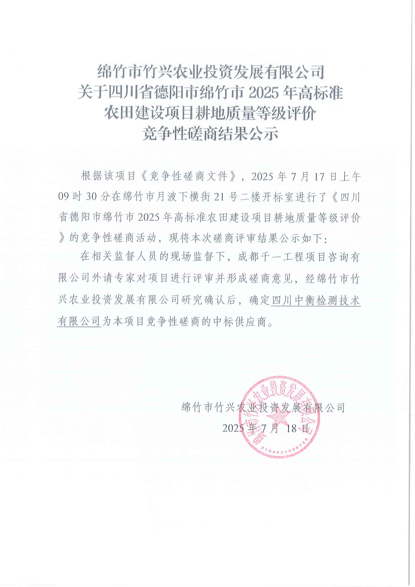 高标准农田建设项目耕地质量等级评价竞争性磋商结果公示