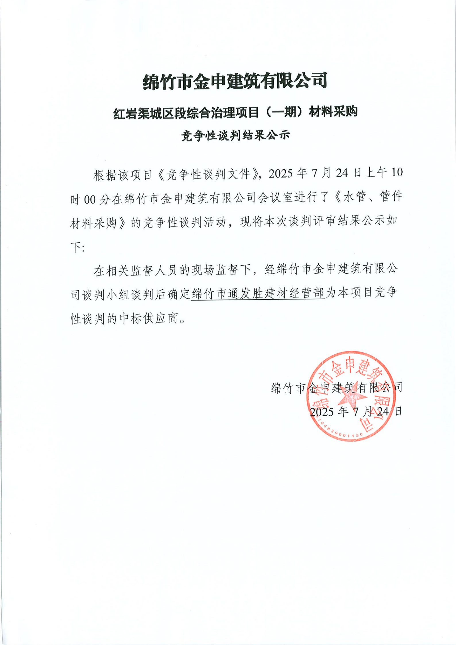 红岩渠一期(水管、管件)中标结果公示