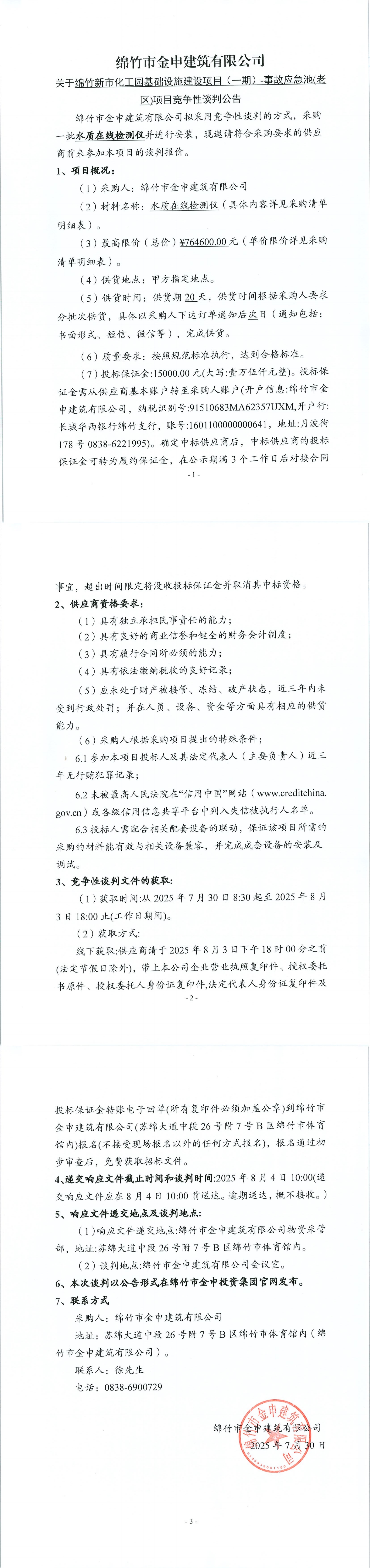 事故应急池(水质在线监测仪)设备竞争性谈判公告