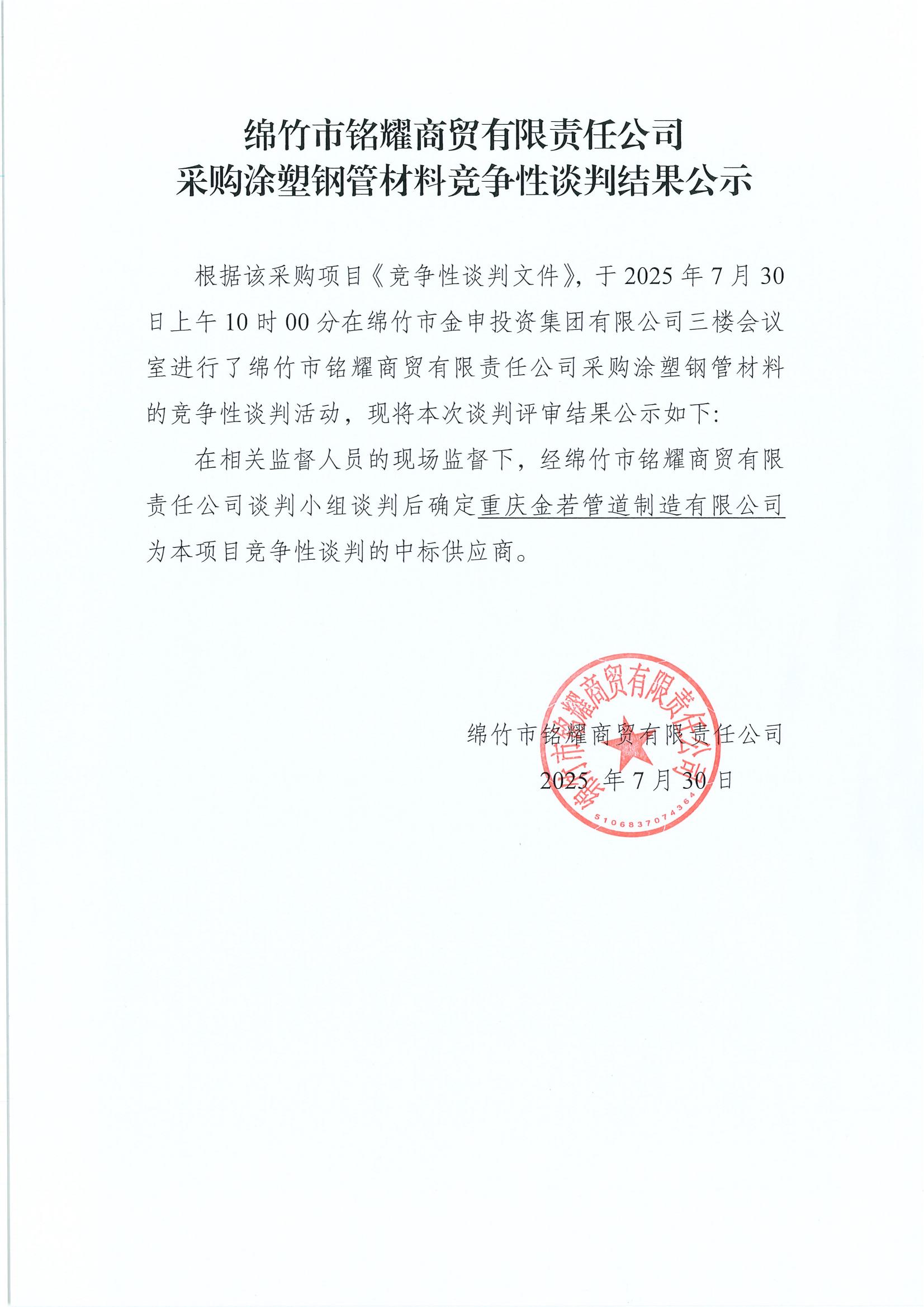 铭耀商贸采购涂塑钢管材料竞争性谈判结果公示