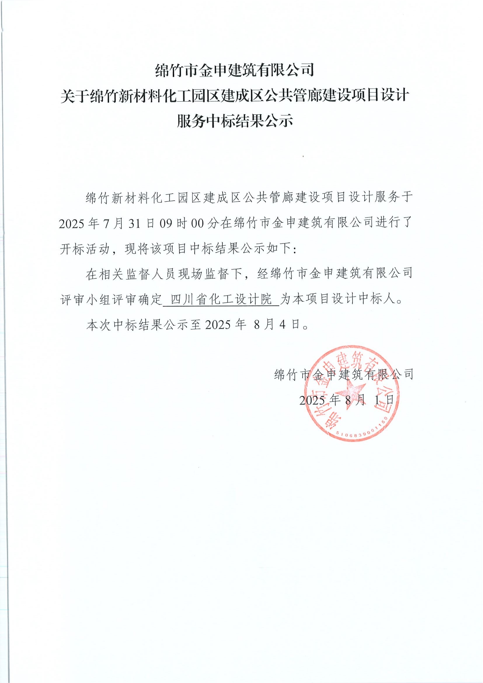 绵竹新材料化工园区管廊项目一期设计服务中标公告